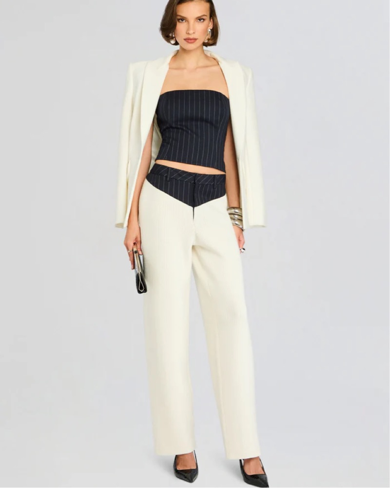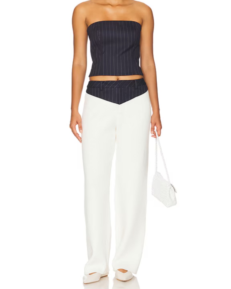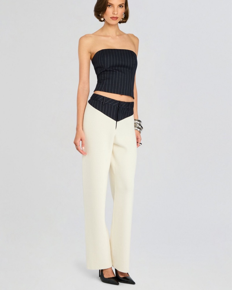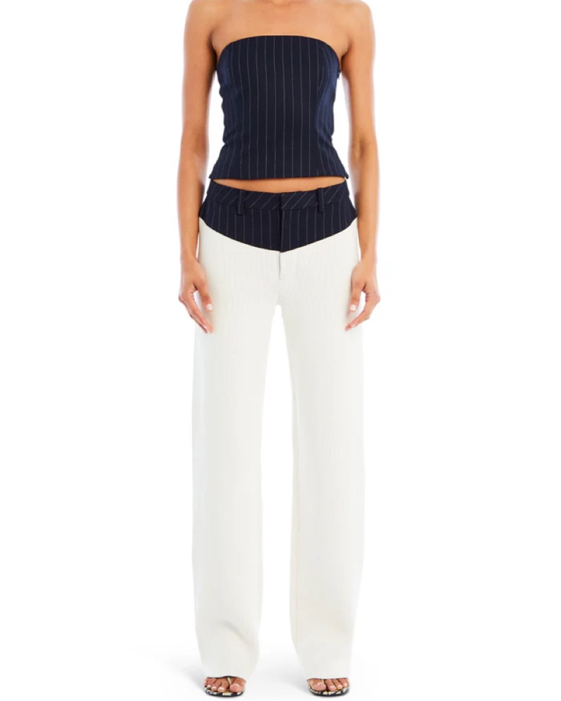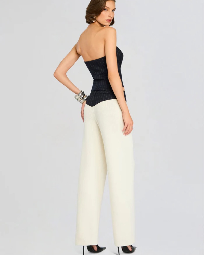 Knit wide leg pants with pinstripe suiting detail at the waist