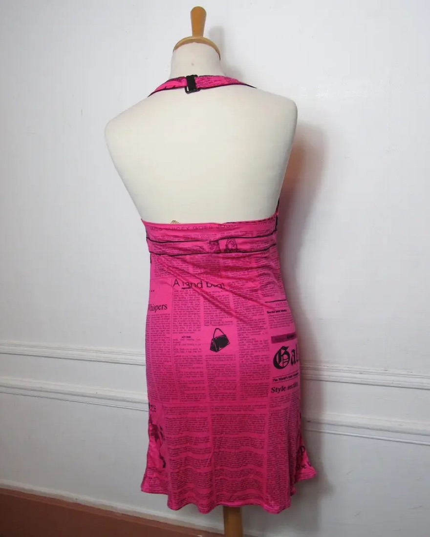 RARE AND VINTAGE JOHN GALLIANO. Print seen on Sarah Jessica Parker and Em Rata. A classic spin on the black and white newspaper dresses but now in pink. Featuring an adjustable wrap neckline. Fits XS-M.