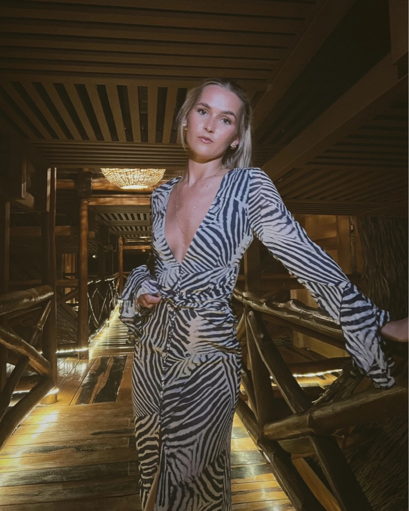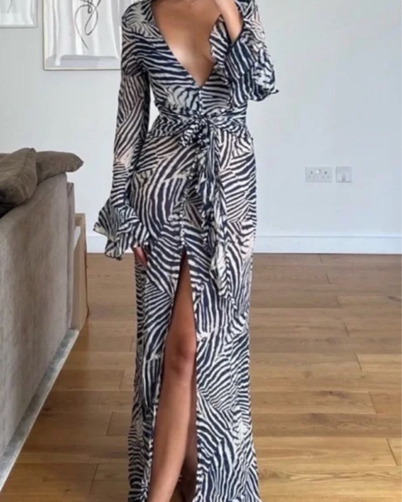 This eye-catching zebra print wrap dress is perfect for a glamorous night out. The bold print and flowing silhouette make it a statement piece that will turn heads.
