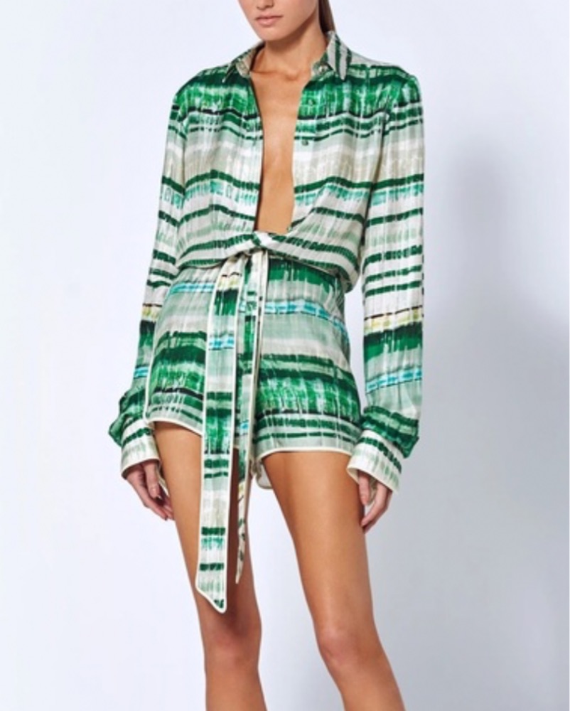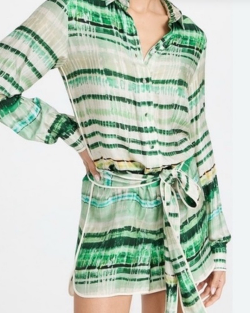 Button up with tie waist. Super cute and person for beach, vacation, or a night out.