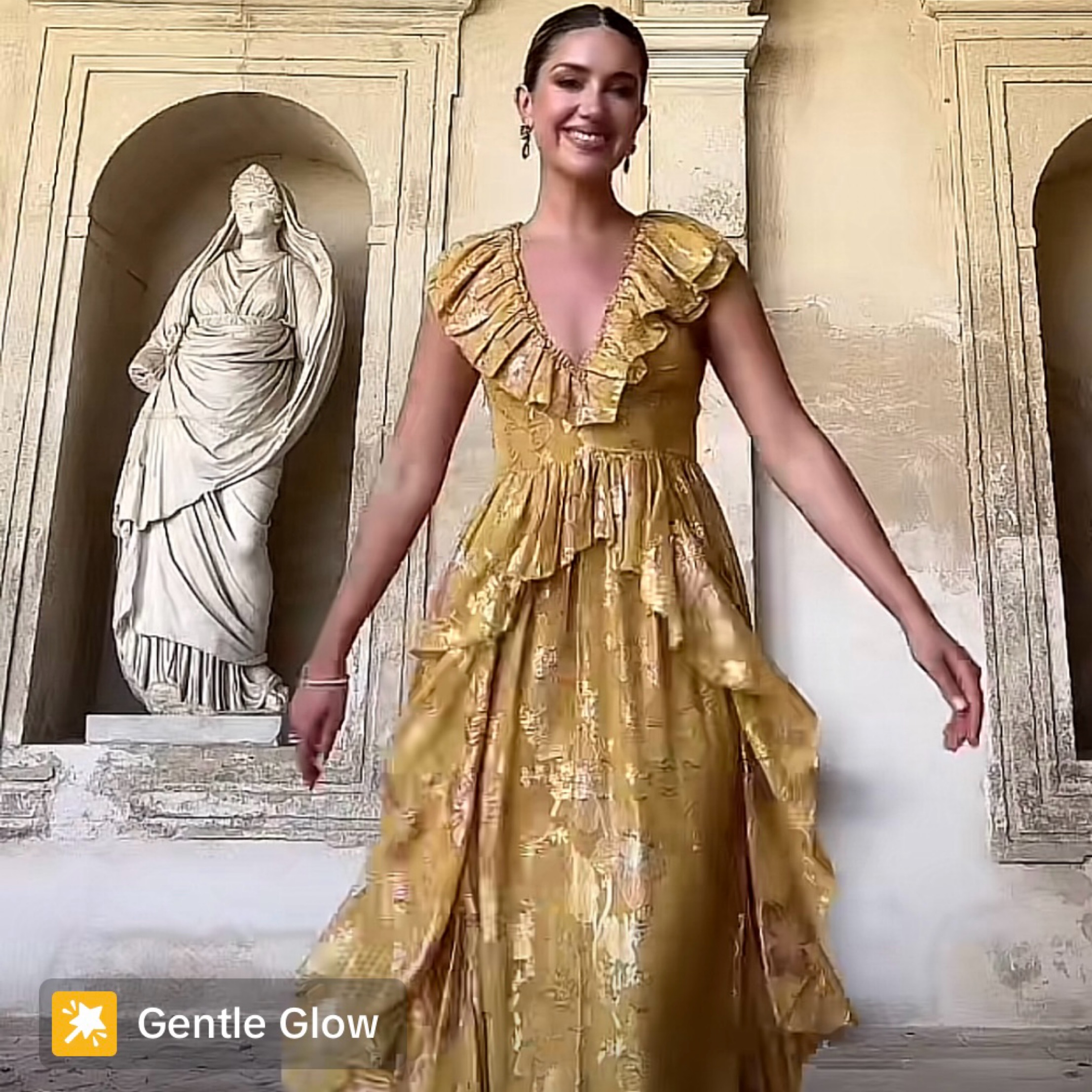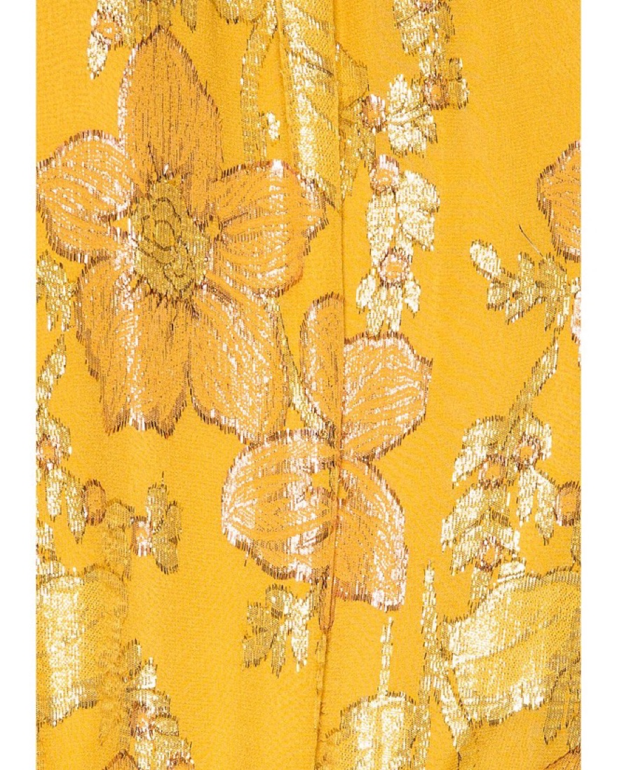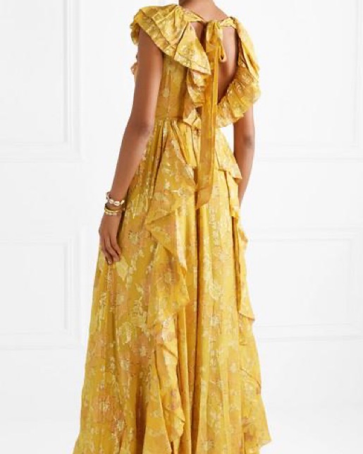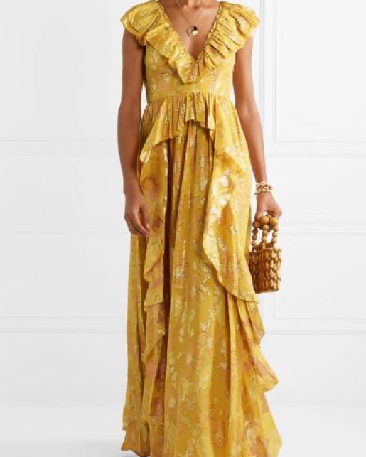 Gold threads embellish this yellow gown from Ulla Johnson. Lots of length and ruffle layers make this a perfect evening dress for any fancy occassion. Black version seen on Cami Mendes