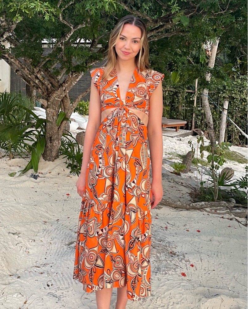 Super fun orange ALC midi dress with cutout and knot detail. Perfect for vacations! I’m 6’0” for reference :)