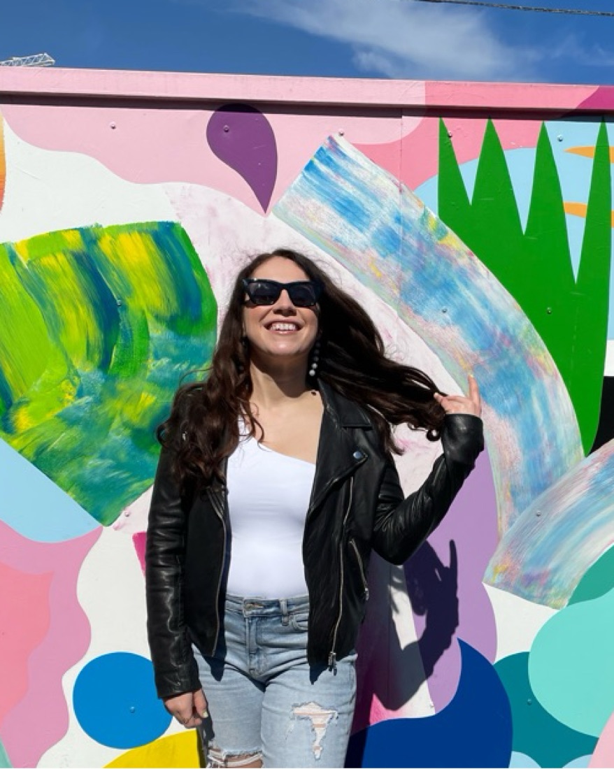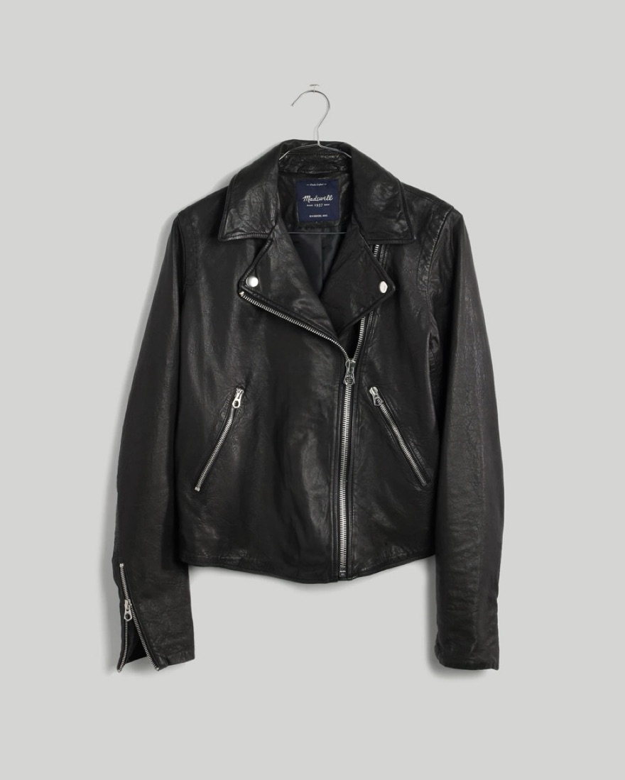 Softest leather jacket ever. Lambskin washed leather jacket from Madewell. Has lots of zippers, fits a size 0-4. Can fit a sweater underneath but it’s a bit of a tight fit in the arms. Cropped silhouette