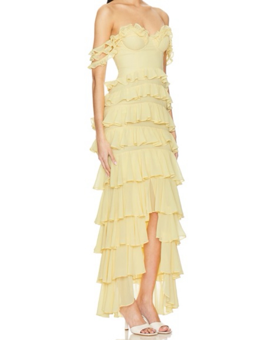 Yellow wedding guest gown from Revolve. Less buttery yellow in person