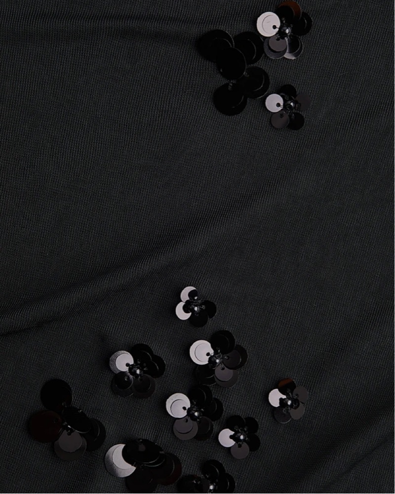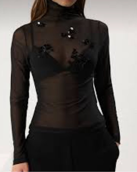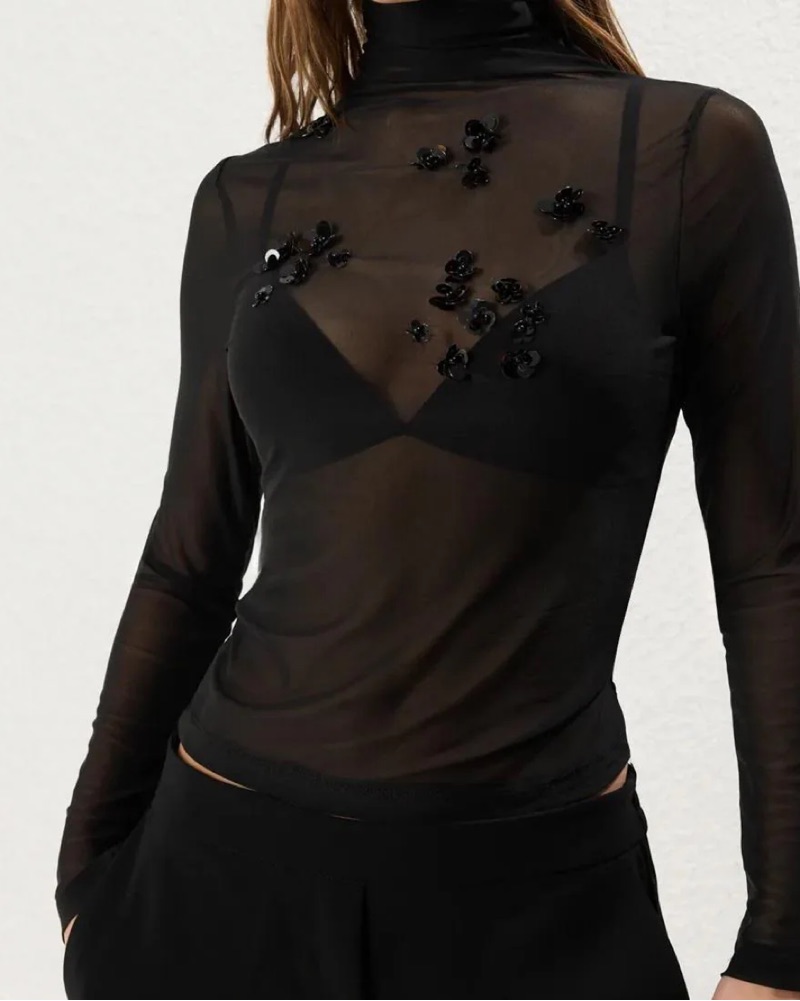 This sophisticated black top features a sheer, mesh-like material adorned with delicate sequin embellishments. Pair it with sleek black pants or a chic midi skirt for an evening out.