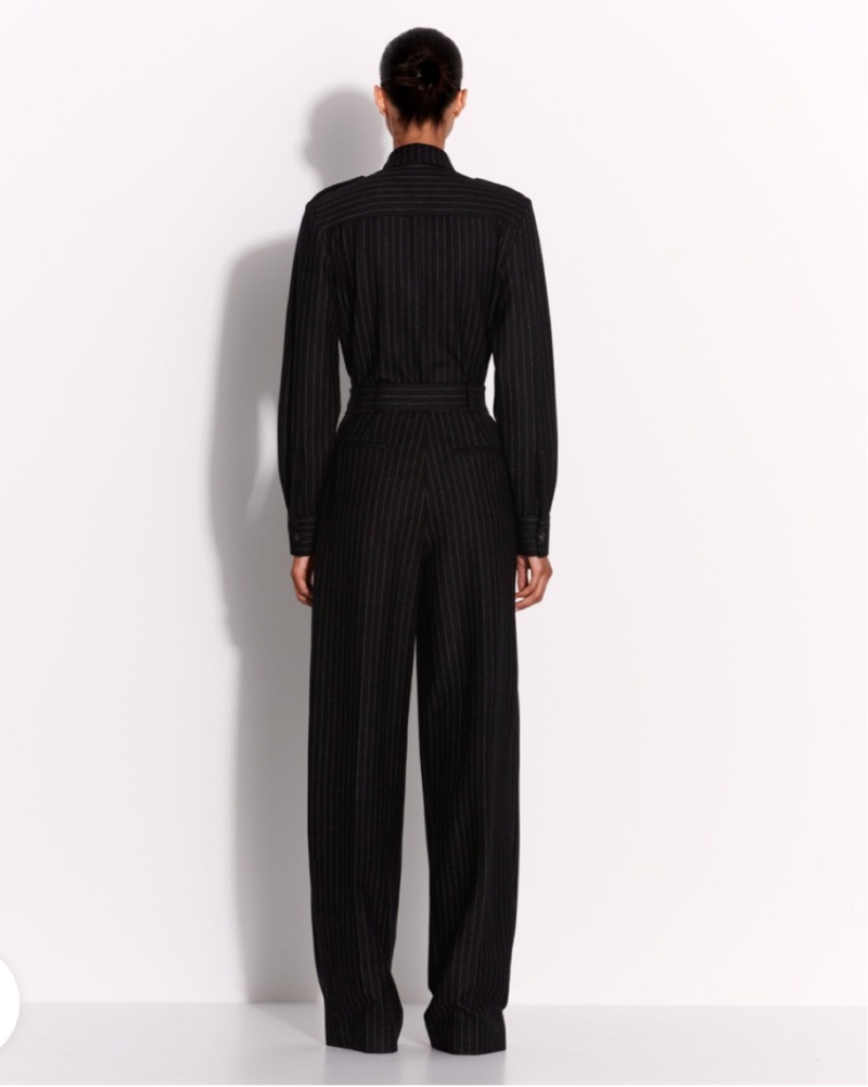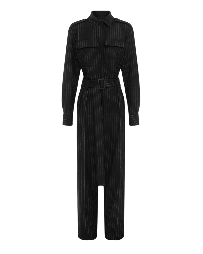 Long Sleeve Belted Jumpsuit in Wool Pinstripe