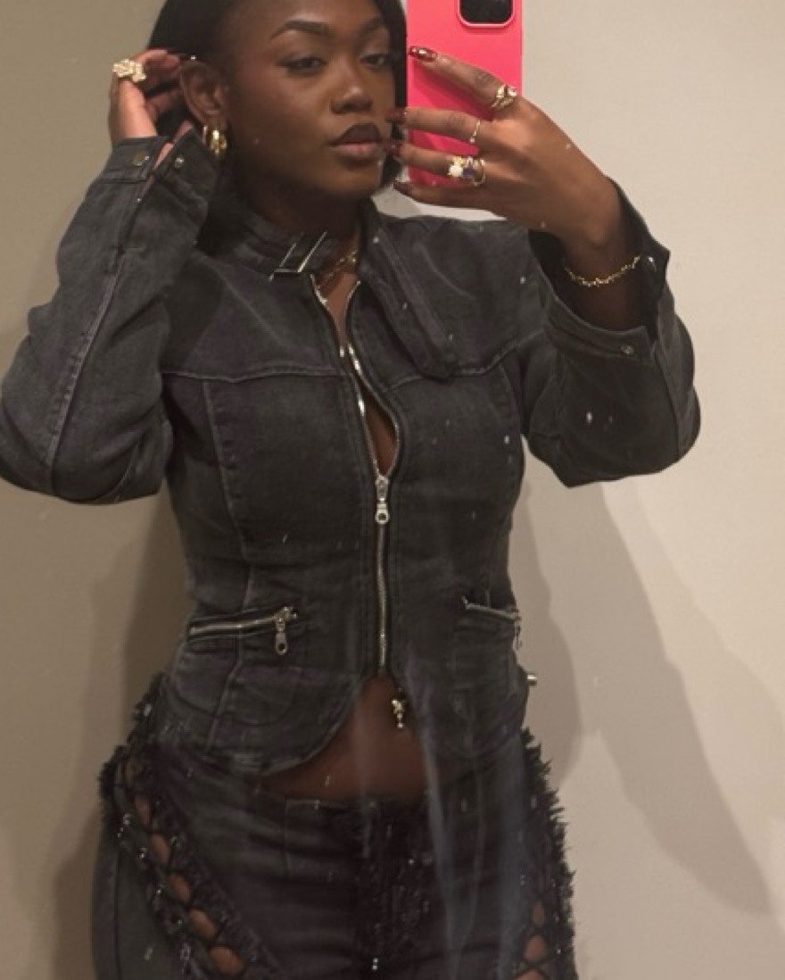 Black denim jacket, with open back lace up detail.