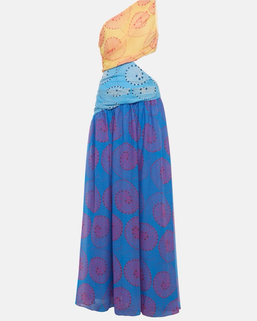 The Ashlyn maxi dress from Staud is a whimsical design that boasts a flattering one-shoulder silhouette and a mid-riff baring cutout. Made from chiffon in three hues, the swirled and dotted print adds dimension and movement.