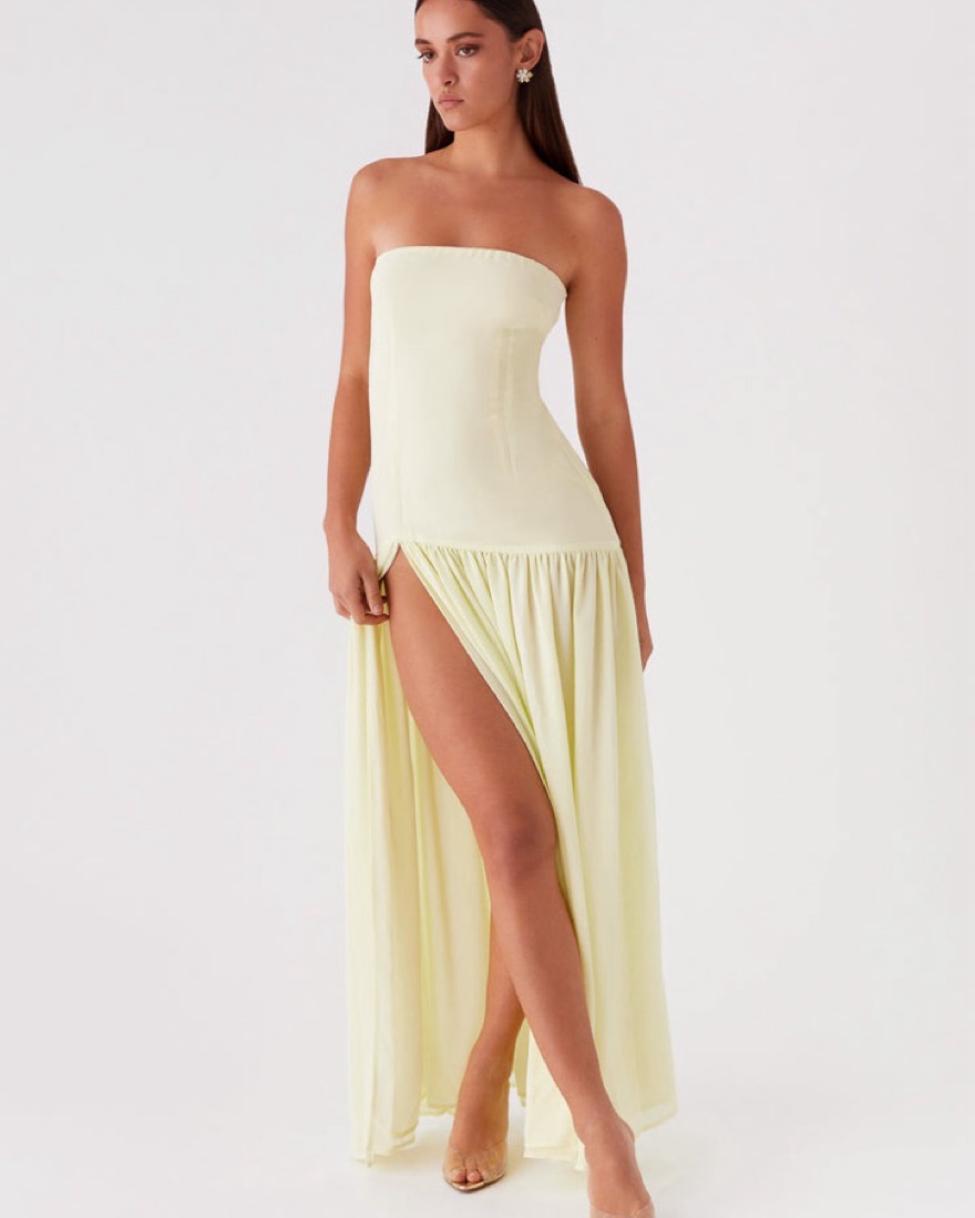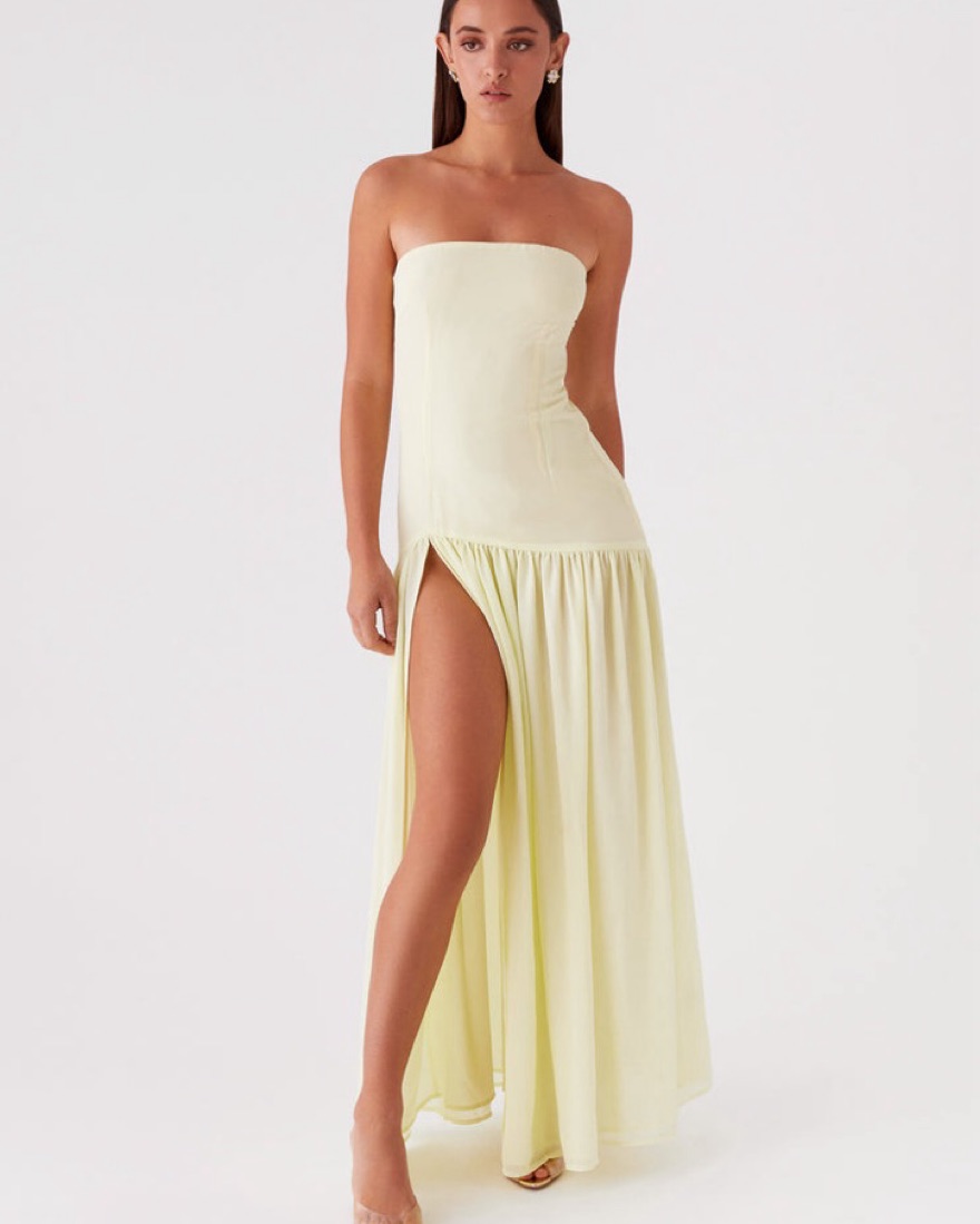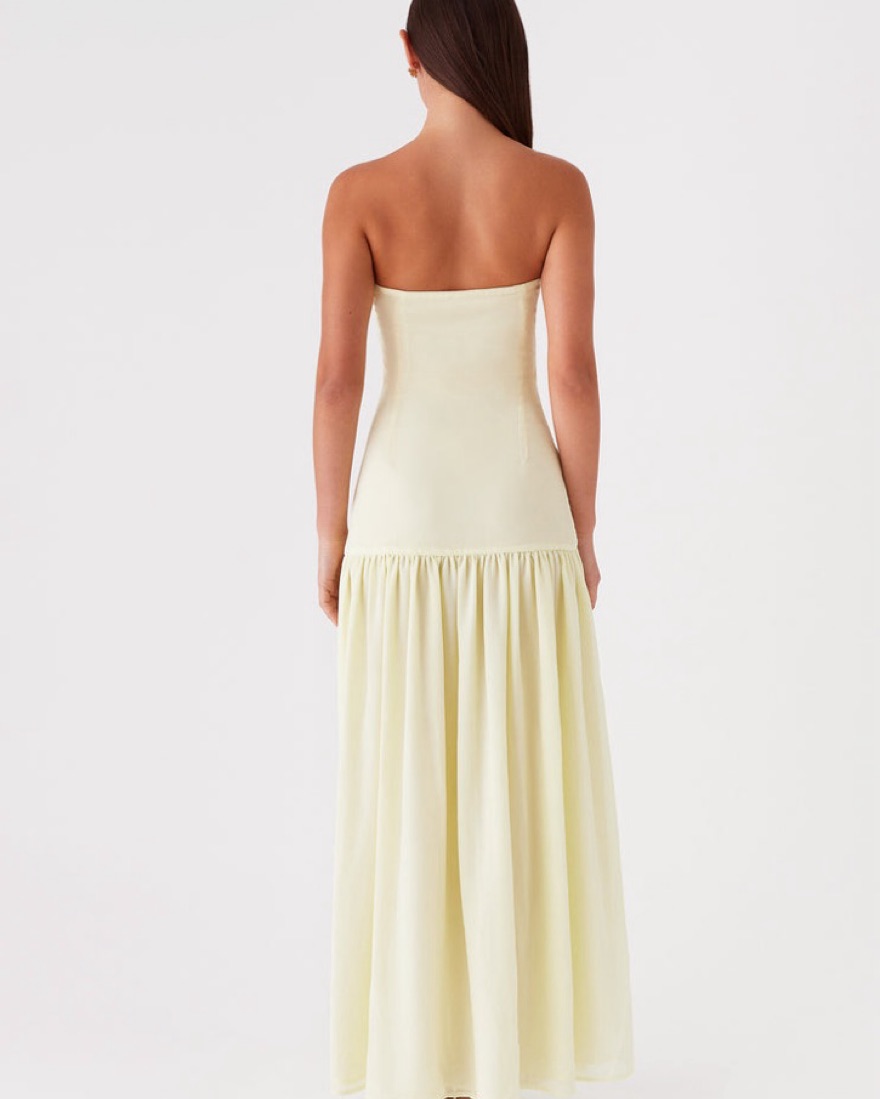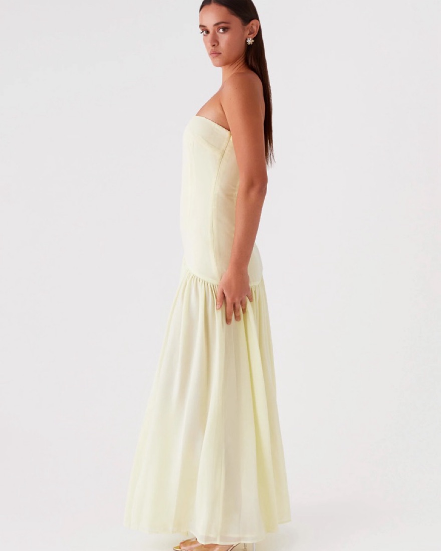 This chic strapless maxi dress is perfect for a formal event or special occasion. The flowing, ruched skirt creates a flattering silhouette.
