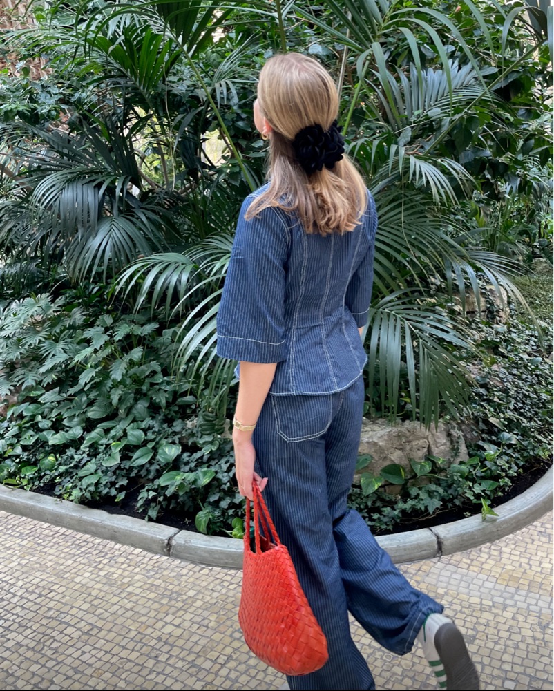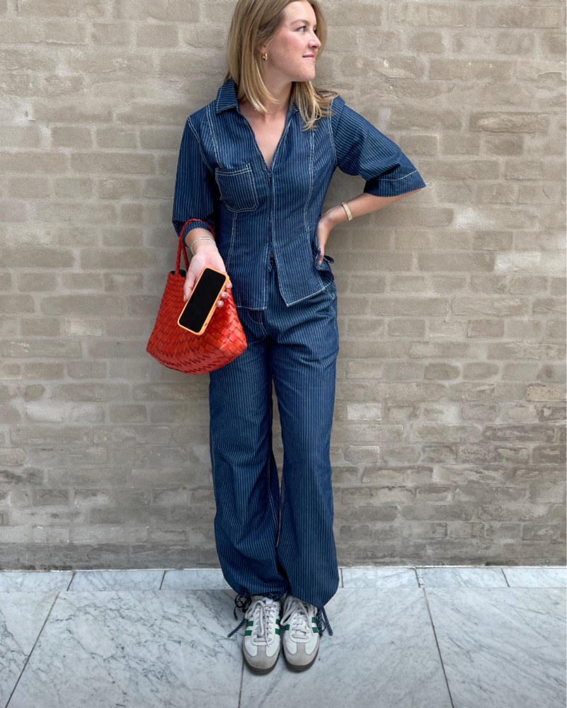 Denim top & pant set bought in Copenhagen! Baggy fit joggers with a pull on waist and tie at bottom. Front of top has a zip and a collar.