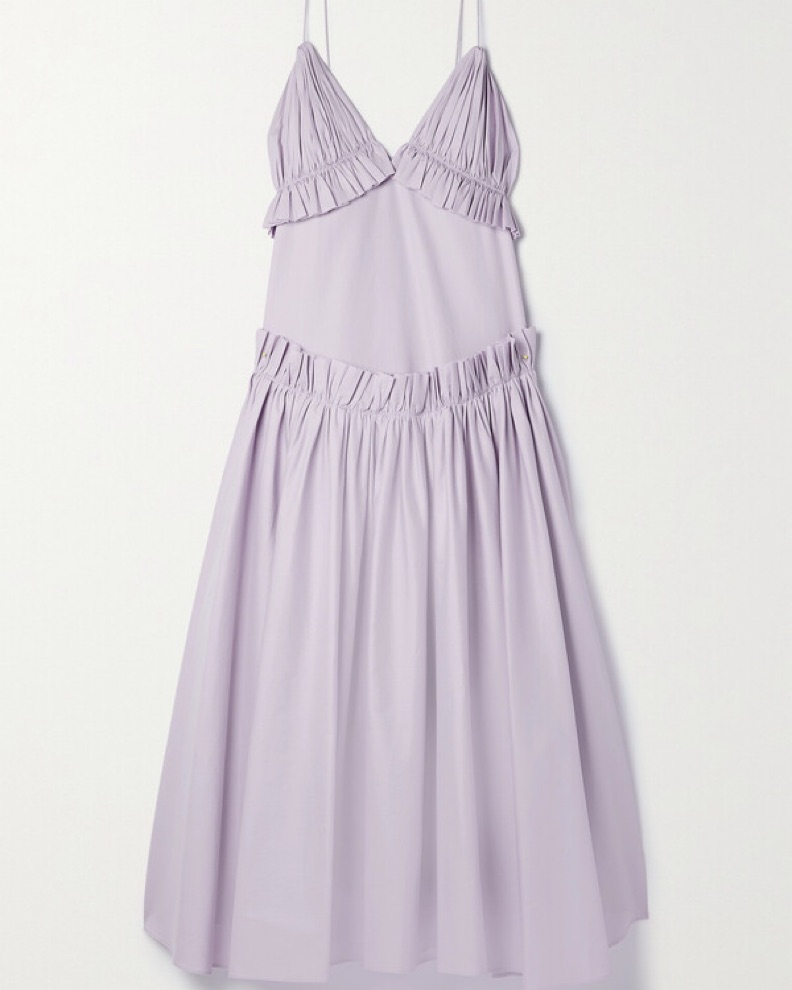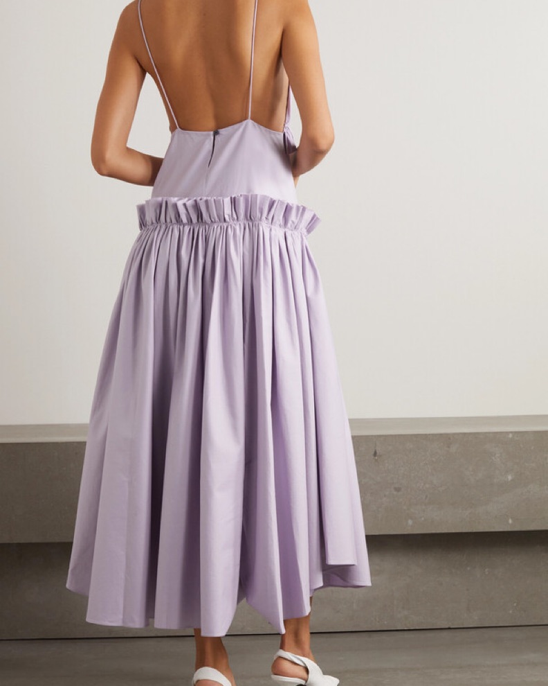 Khaite's Andrina dress has a slip silhouette with thin shoulder straps, pleated triangular cups and a drop-waisted circle skirt with ruffled raw edges. It's made from fine cotton twill that's washed for a relaxed finish. New with tags. Size L. US 8/10. Open to offers.