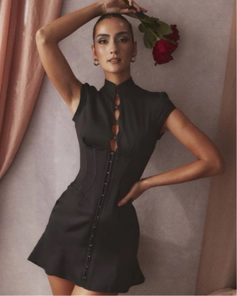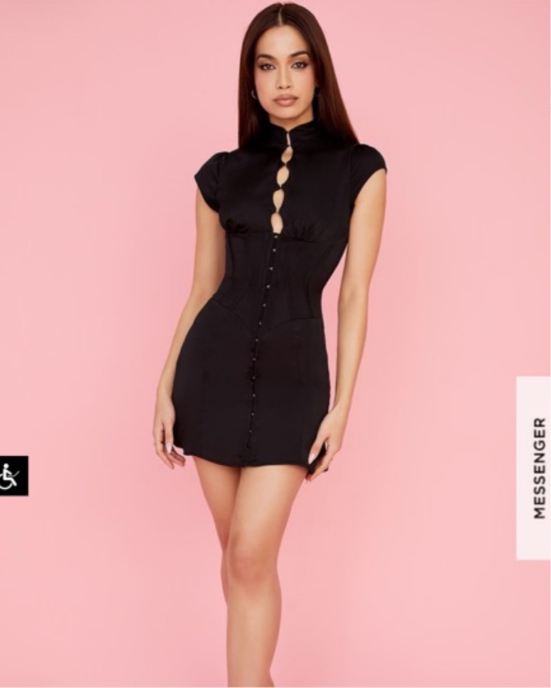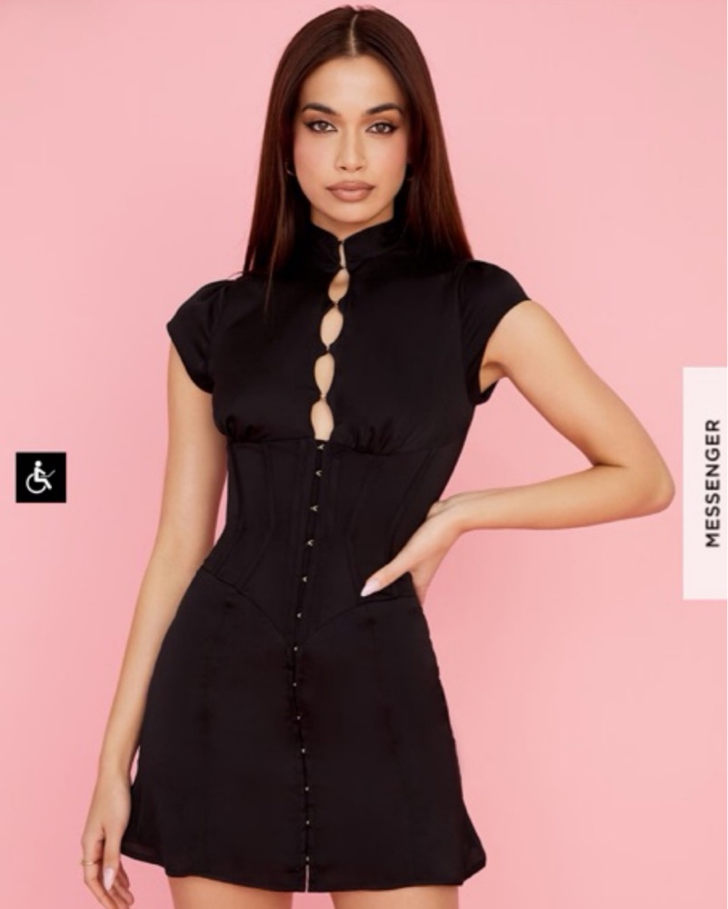 Black satin fluted corset mini dress. Perfect for party nights, dinner dates, cocktail bars. Length: approximately 88 cm
