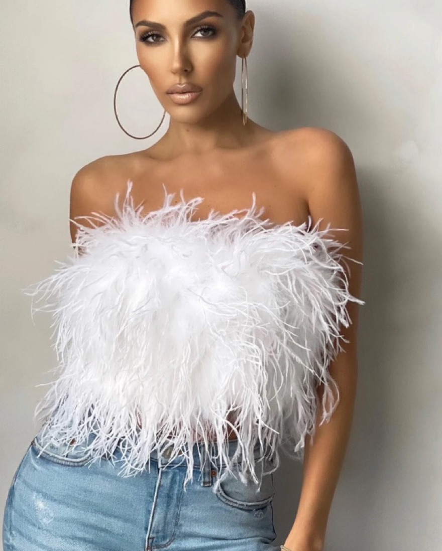 From Club L London. “Dream Daze white feather bandeau crop top” It has a zip closure on the back.