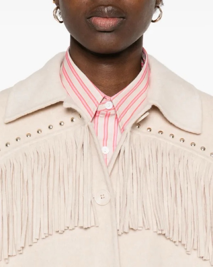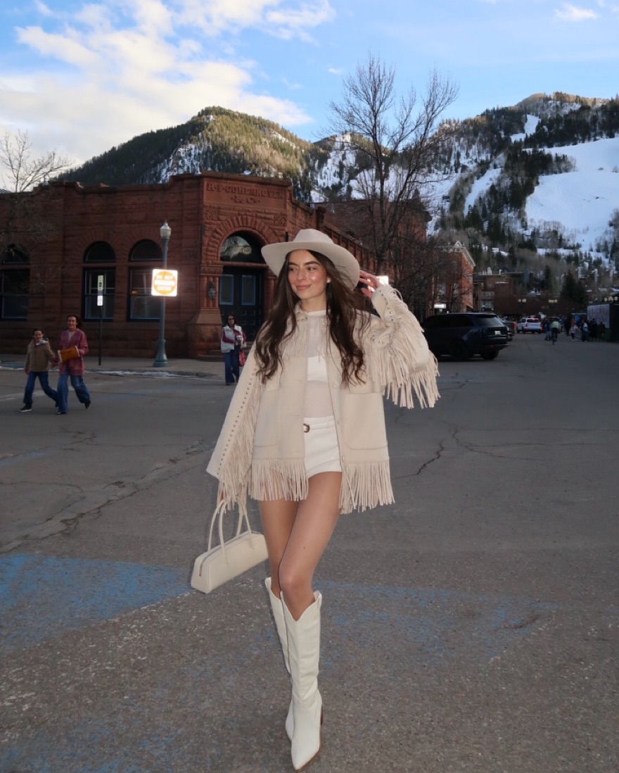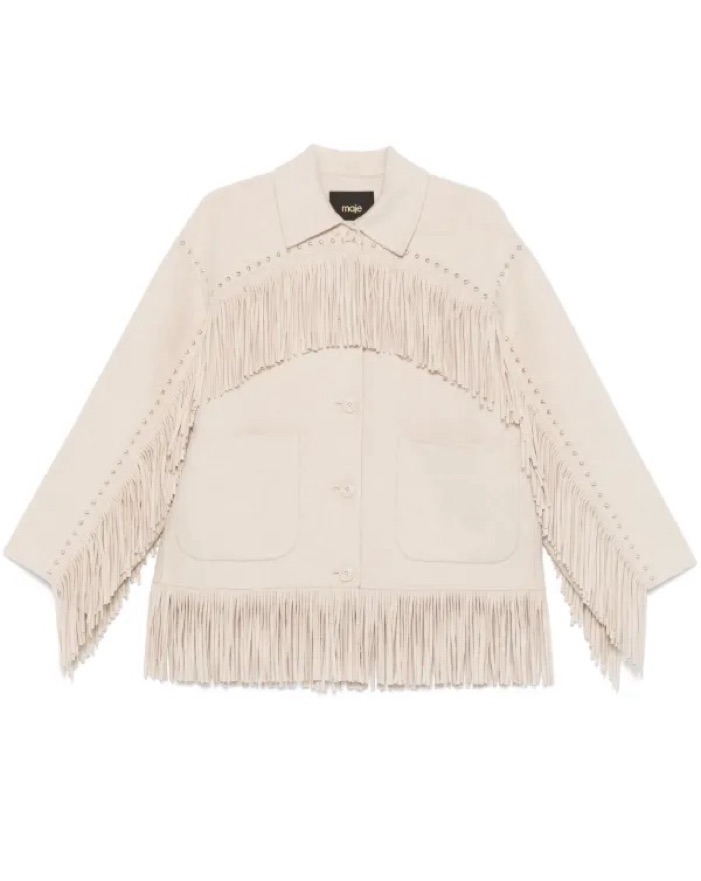 Renting my beige fringe jacket from the brand Maje so cute for Aspen or an apres ski trip wore for my bachelorette to Kemo sabe cutest jacket with silver metal studs