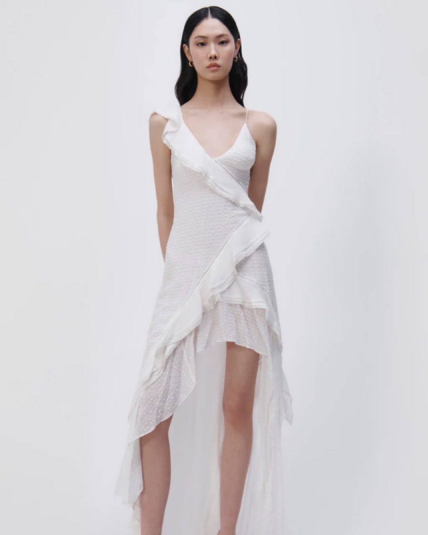 The Exclusive Lyra Silk Maxi Gown in White. An archival runway hero gown revived, this cascading silk-georgette maxi is delicately framed by feminine ruffles and intricate lace detailing that highlights an ethereal, elevated silhouette