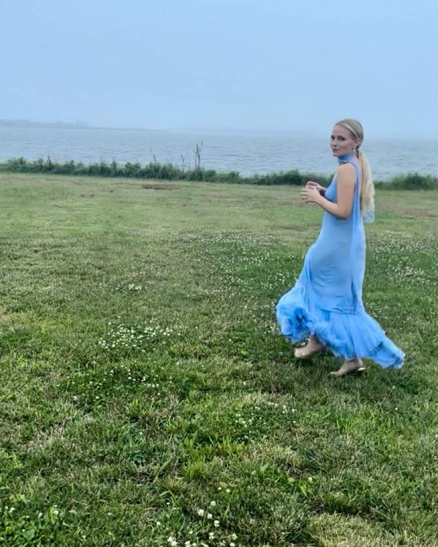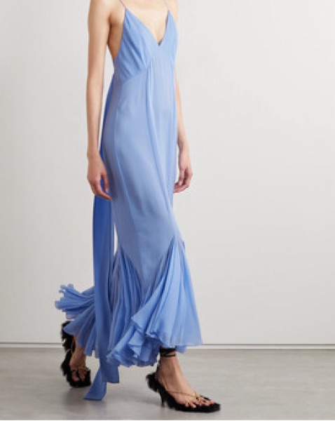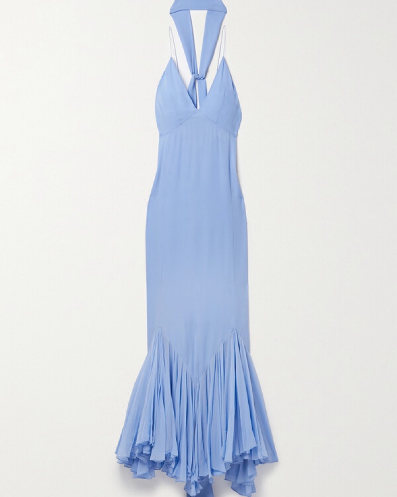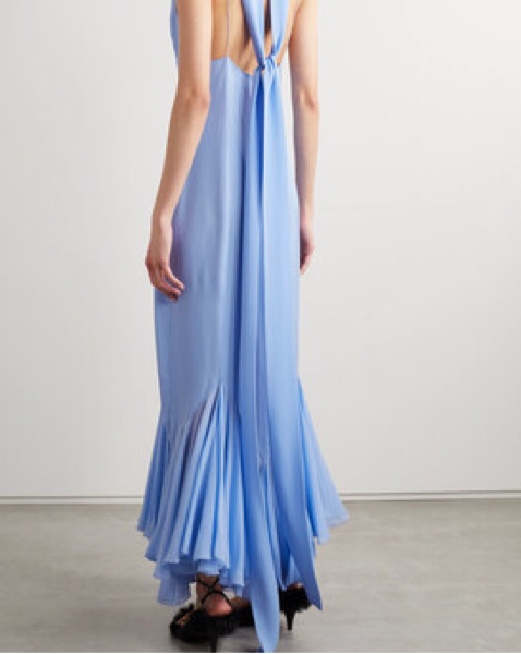 My favorite dress of all time 🩵 the dress is a designer size 4 but fits like a true 2. Please handle with extreme care. The fabric is delicate and the dress is very expensive to clean, hence the price. No fit returns. I will charge extra for any damage.