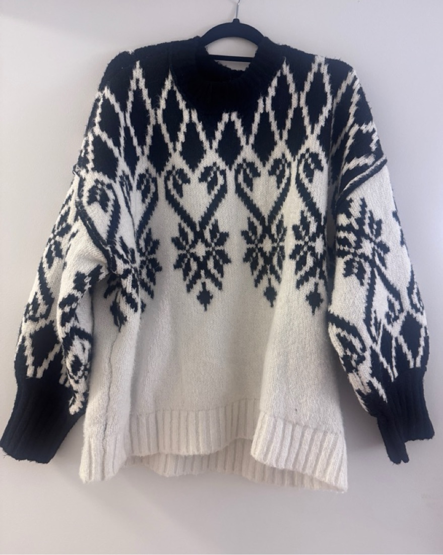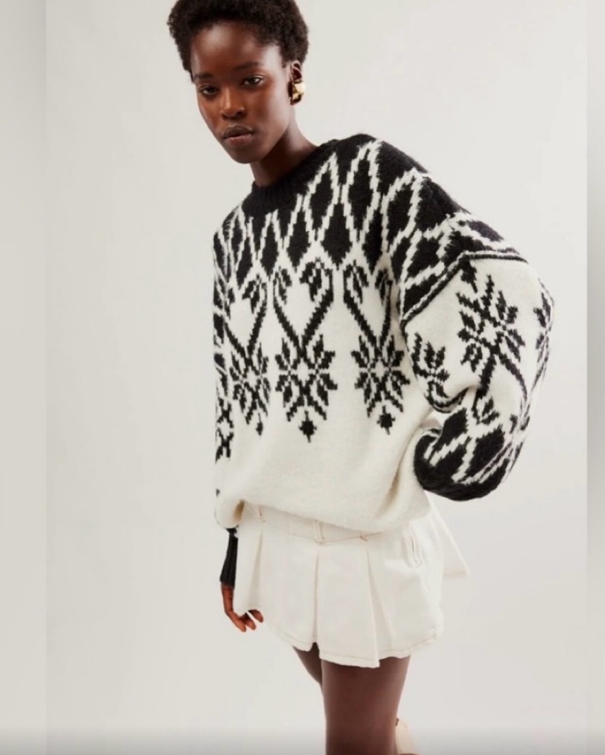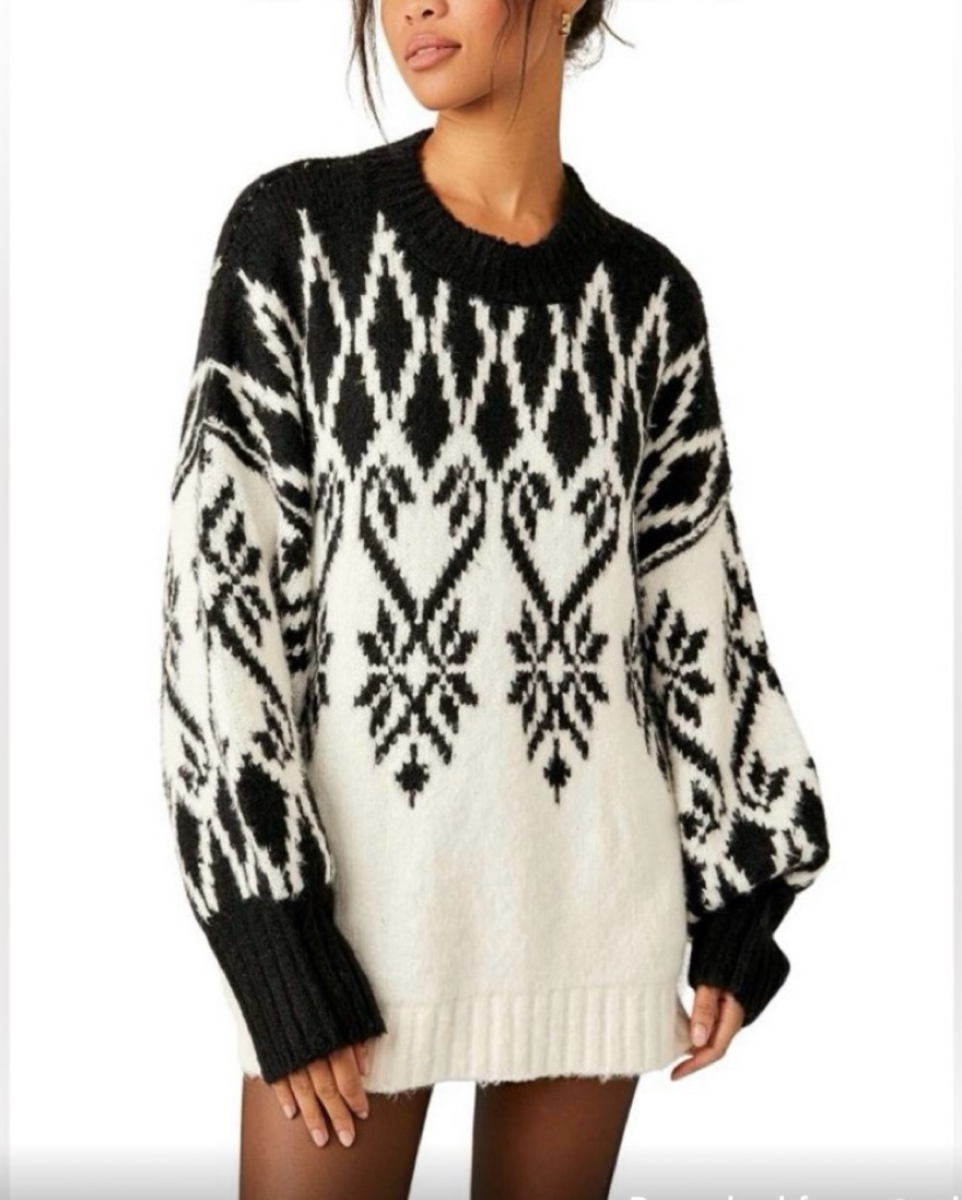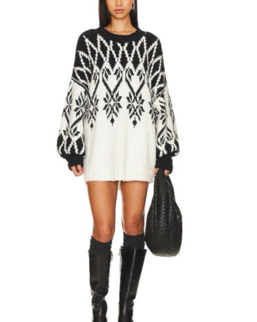 This striking jacquard knit dress features an eye-catching monochrome pattern that instantly elevates any look. The oversized silhouette and voluminous balloon sleeves add a cozy yet stylish touch. This can be worn as a sweater or a dress. For reference I am 5’9” and this does not cover my butt.
