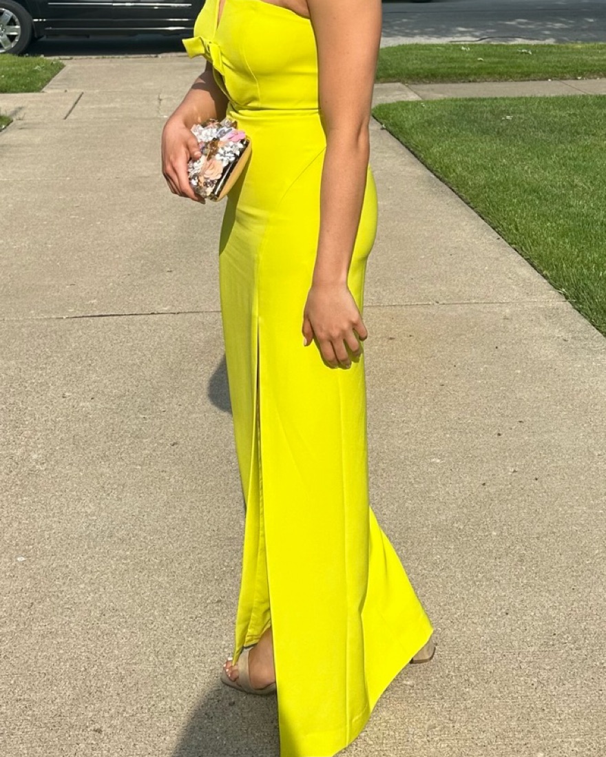 Worn once for a wedding. High slit with keyhole bow detail. Built in bra cups and fabric provides stretch. Fits like a 2/4.