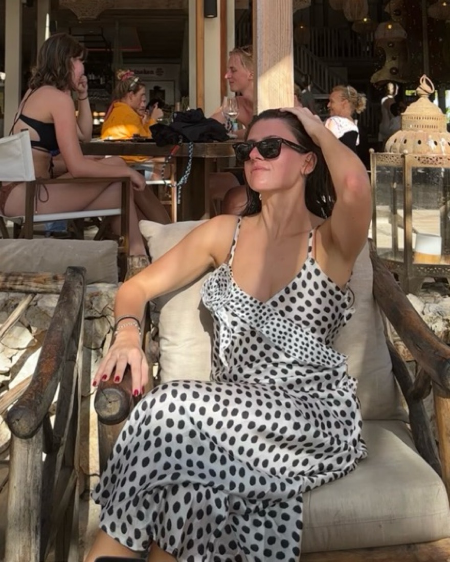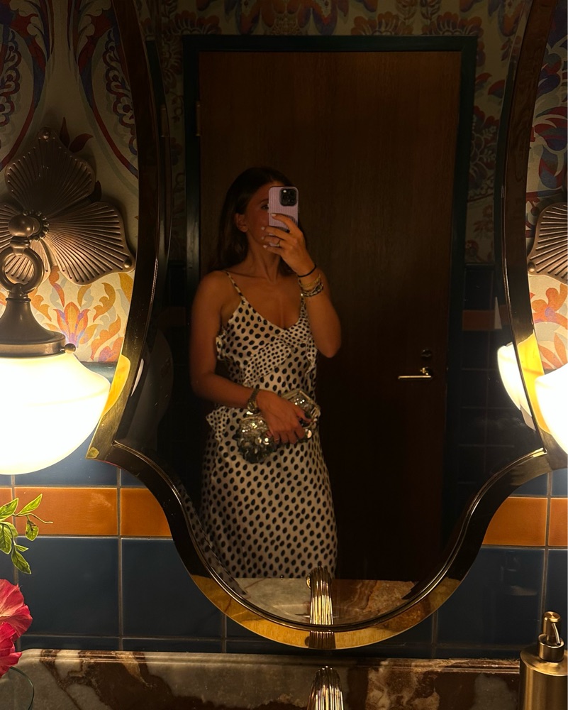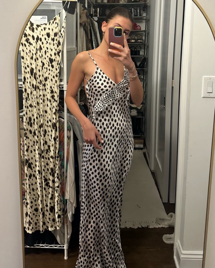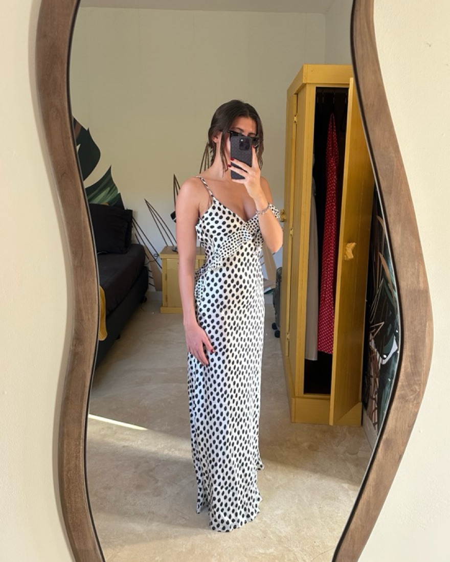 This stunning polka dot maxi dress is perfect for a night out or special occasion. Very figure-fitting.