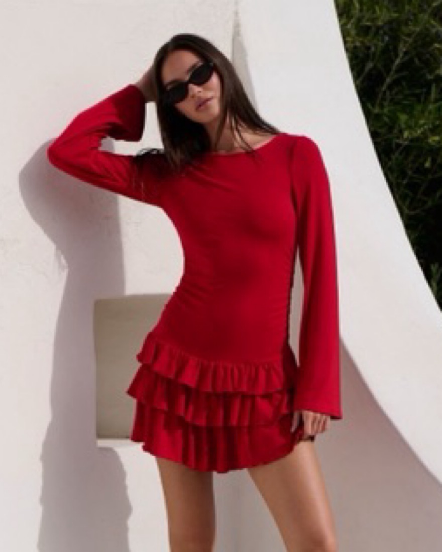 This eye-catching red mini dress with ruffled detailing is perfect for a night out on the town. The flattering silhouette and vibrant hue make it a stylish choice for a variety of occasions.