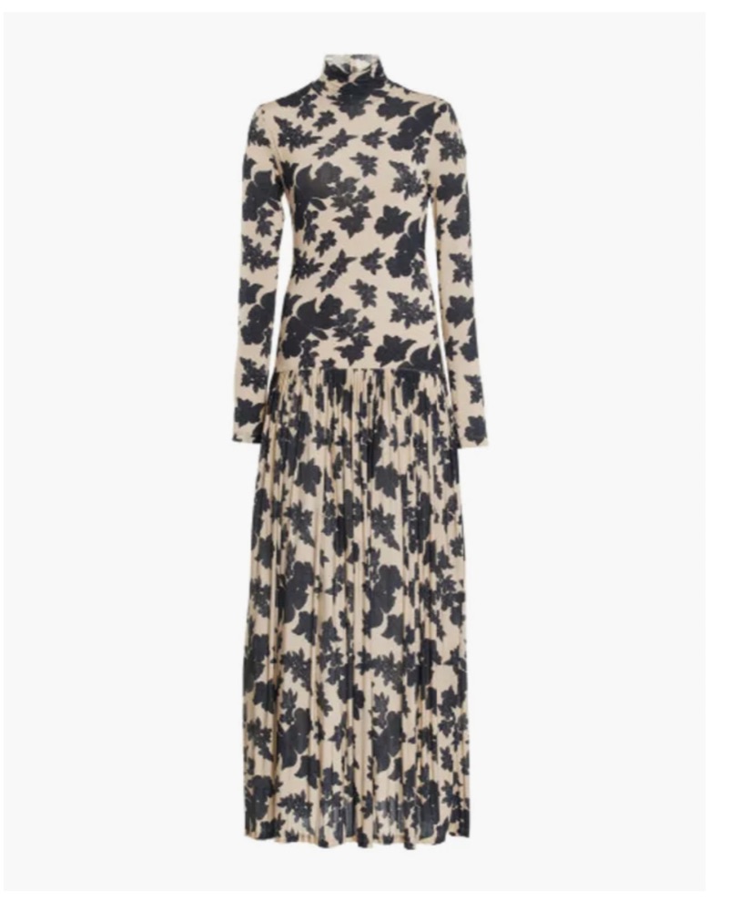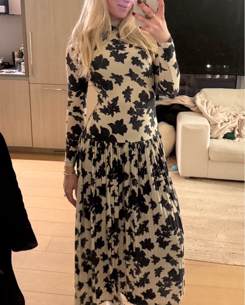 Floral print ulla Johnson stretchhy knit dress. Doesn’t show white, it’s a true nude undertone. Fits true to size or a 2/4! Would not work for a size 6. I wore this to a bridal shower! It doesn’t lean white