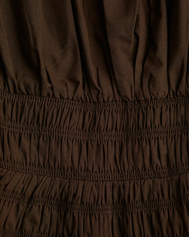 This versatile brown mini dress with gathered ruffles is perfect for a night out or a casual weekend brunch. Never worn, new with tags, fits S/M.