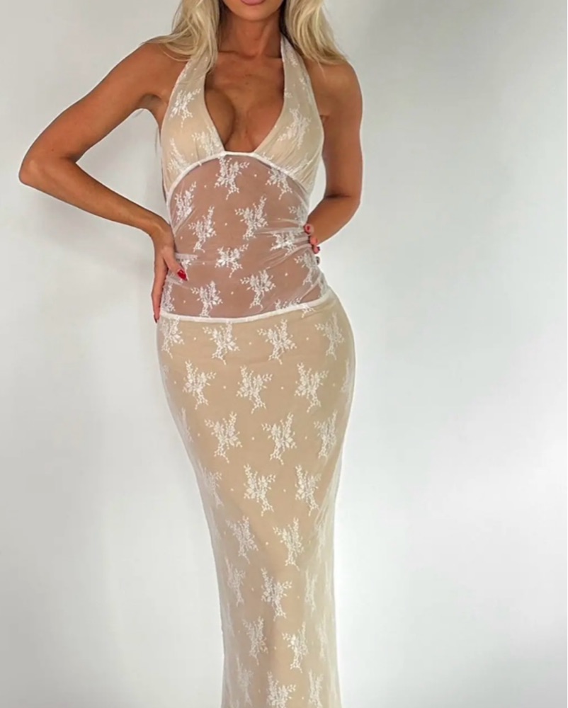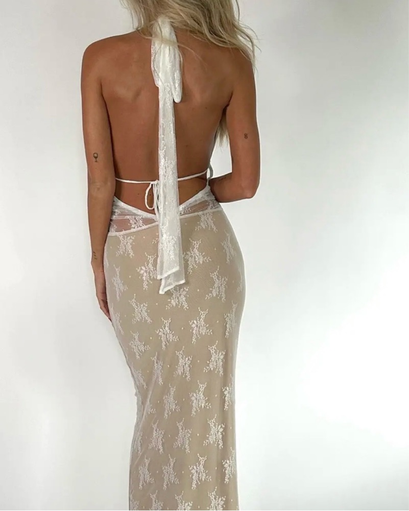 White Maxi Tiger Mist Lace Dress. Low V neck, halter tie neck, low back dress. Perfect for date night and vacay. Never worn!!