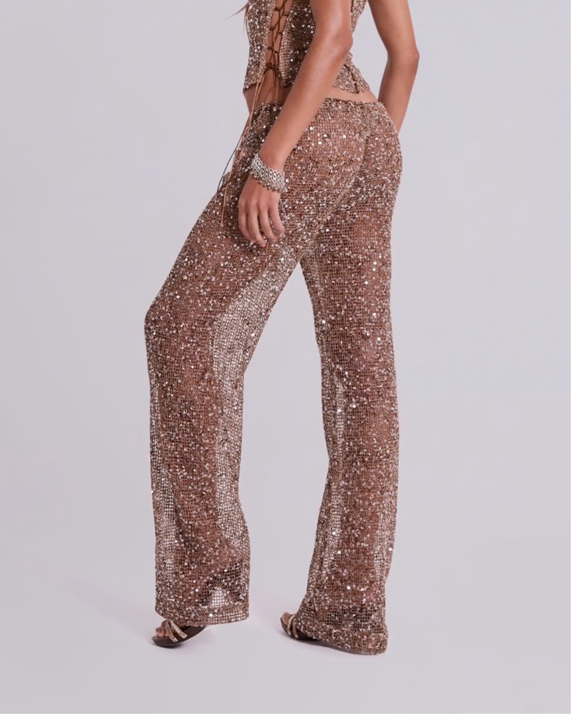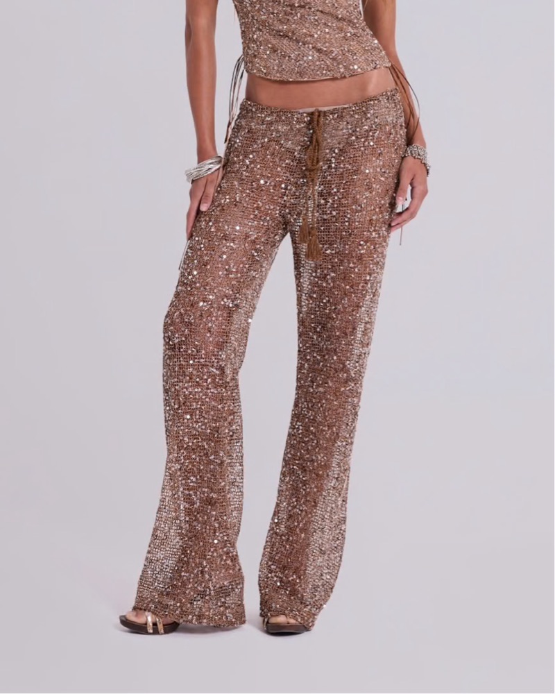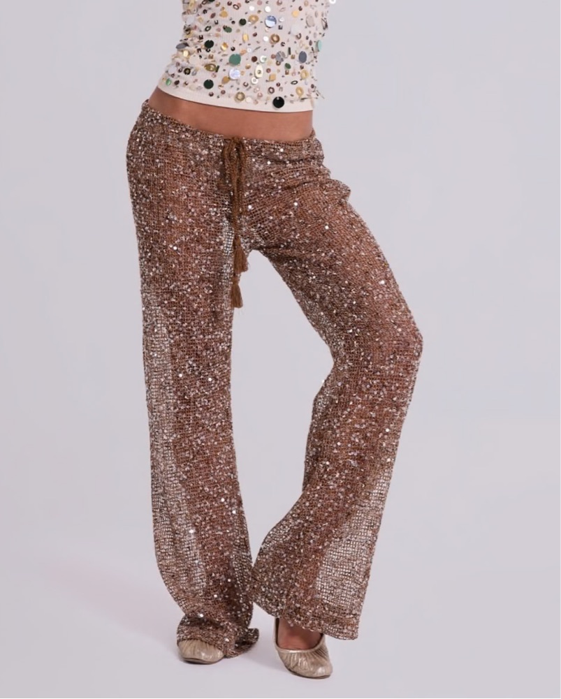Just the pants, not the top! Brown sequin mesh fabric, super cute beach/pool cover up, adjustable drawcord waist. Size uk12/us6
