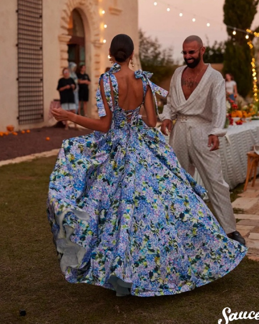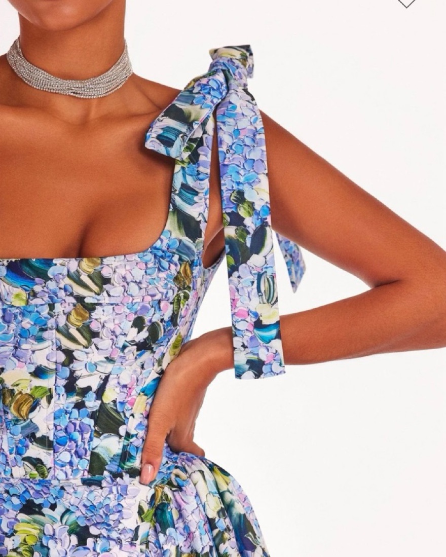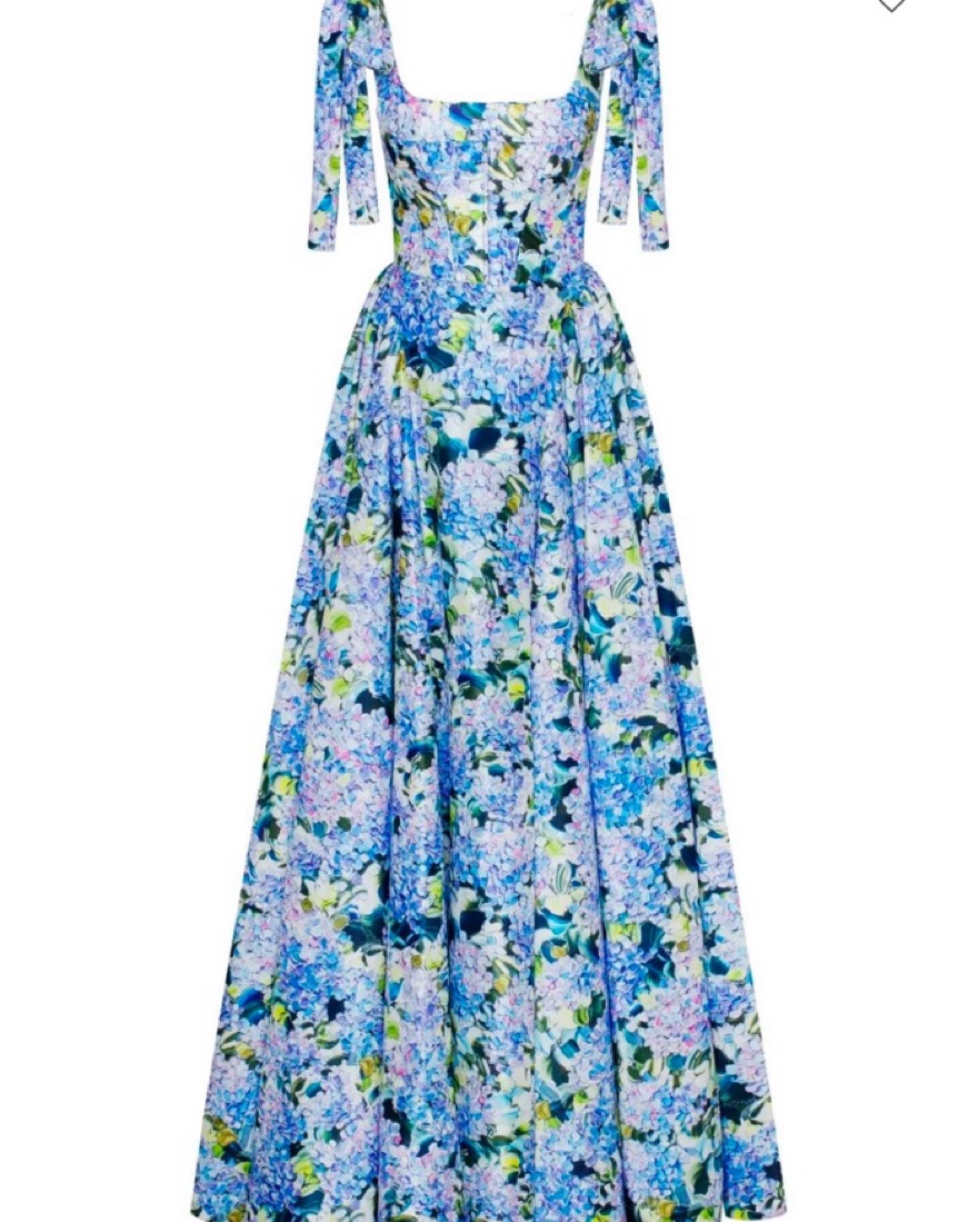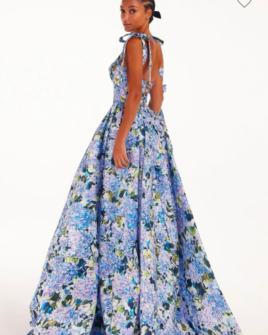 Blue Hydrangea tender tie-strap maxi dress is made of taffeta. Featuring a maxi full skirt, fitted bodice with bow straps, and lace-up closure. The gown is created in a blue floral print. Worn once, I’m 5’2 and had length adjusted a bit but it was still long on me with heels.