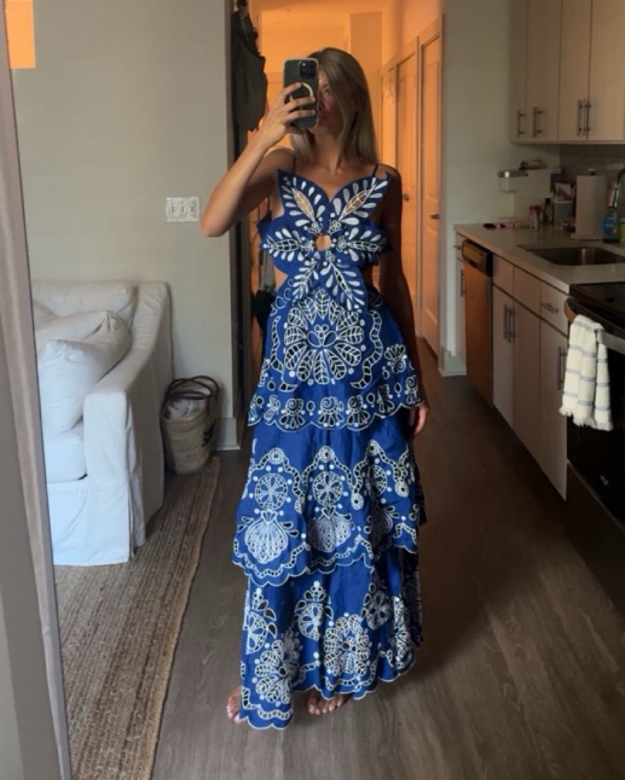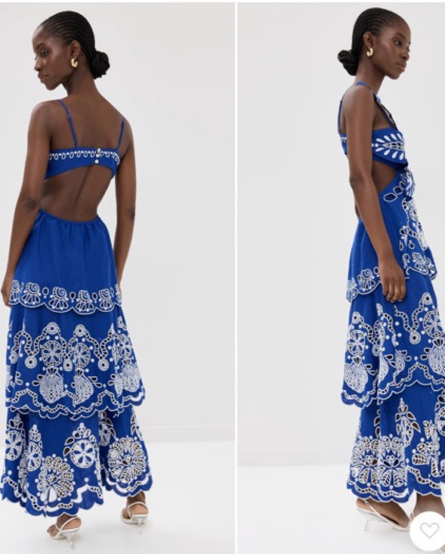 Charming linen dress with mid-weight, non-stretch fabric, featuring a front O-ring accent, floral cutouts, and ladder-stitch trim. Designed with a tiered skirt, scalloped edges, V neckline, and adjustable shoulder straps. Complete with buttons at the back and a lined interior. Shell: 100% linen; Lin