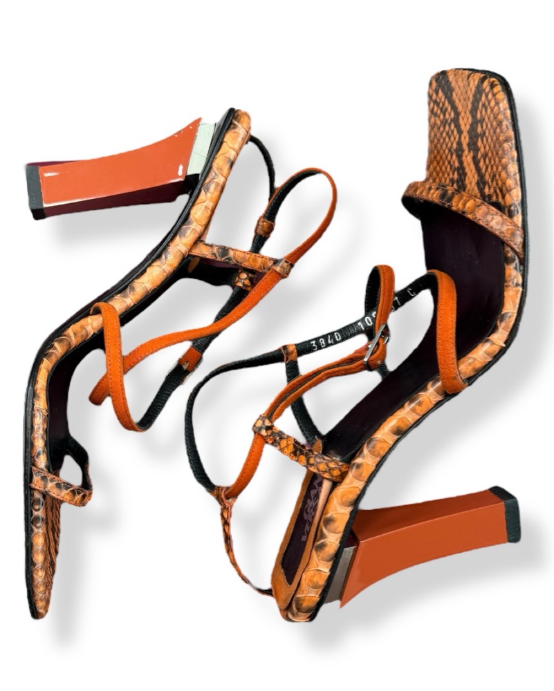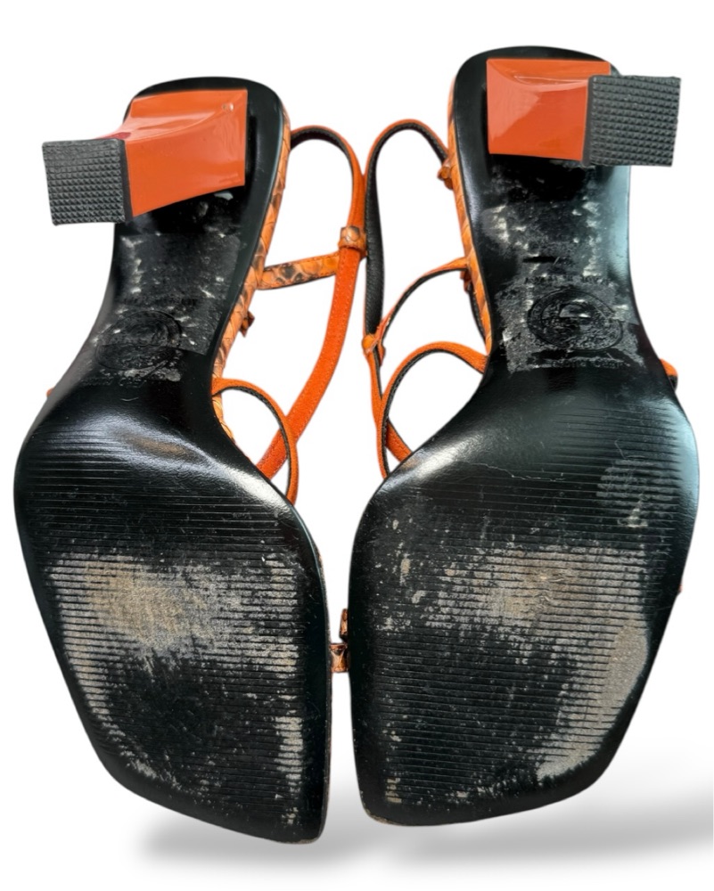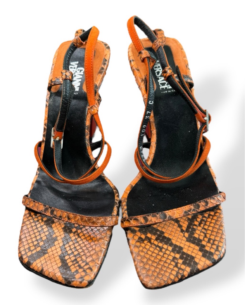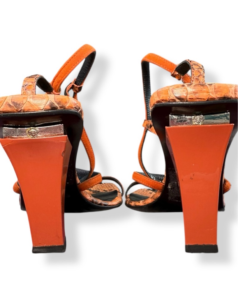 Insane vintage Versace orange and black strappy python sandals. Sz 37/7. In good vintage condition with a couple of nicks to the lacquer on the left heel. Straps have minor lifting at insoles. There are 3 larger flaws on the heels that *do not* impact their structural integrity. Light sole wear
