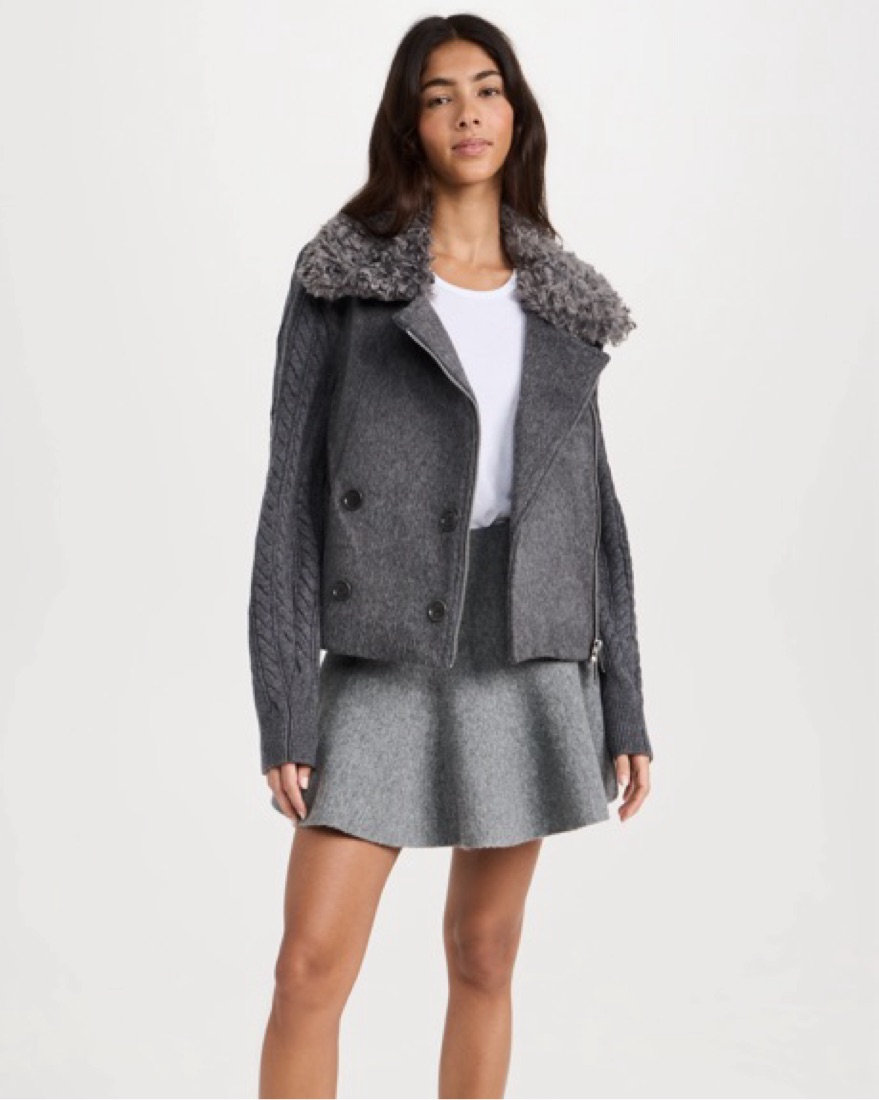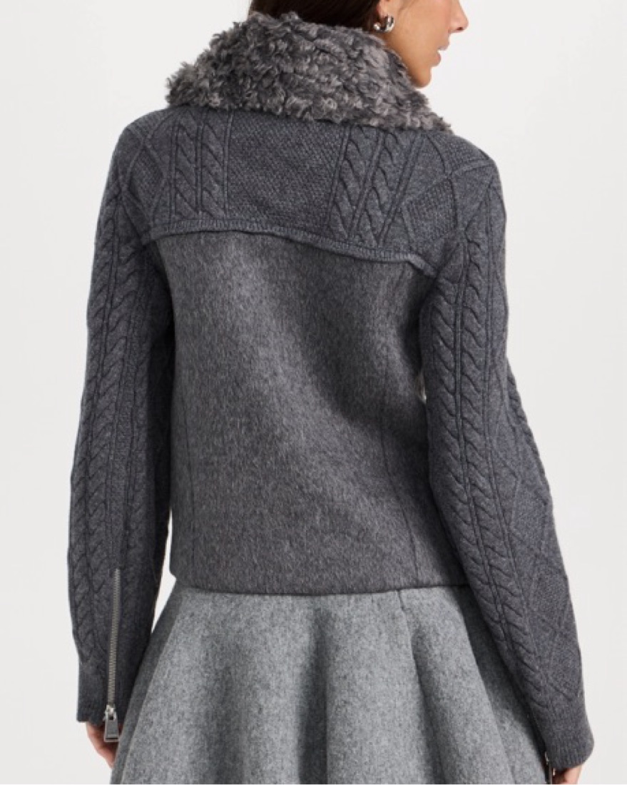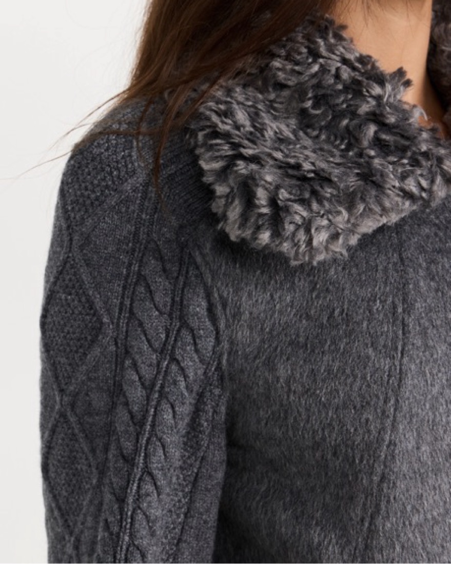 This chic gray jacket is perfect for staying warm. It has the warmth of a coat. The faux fur collar and cable knit detailing are exceptionally soft.