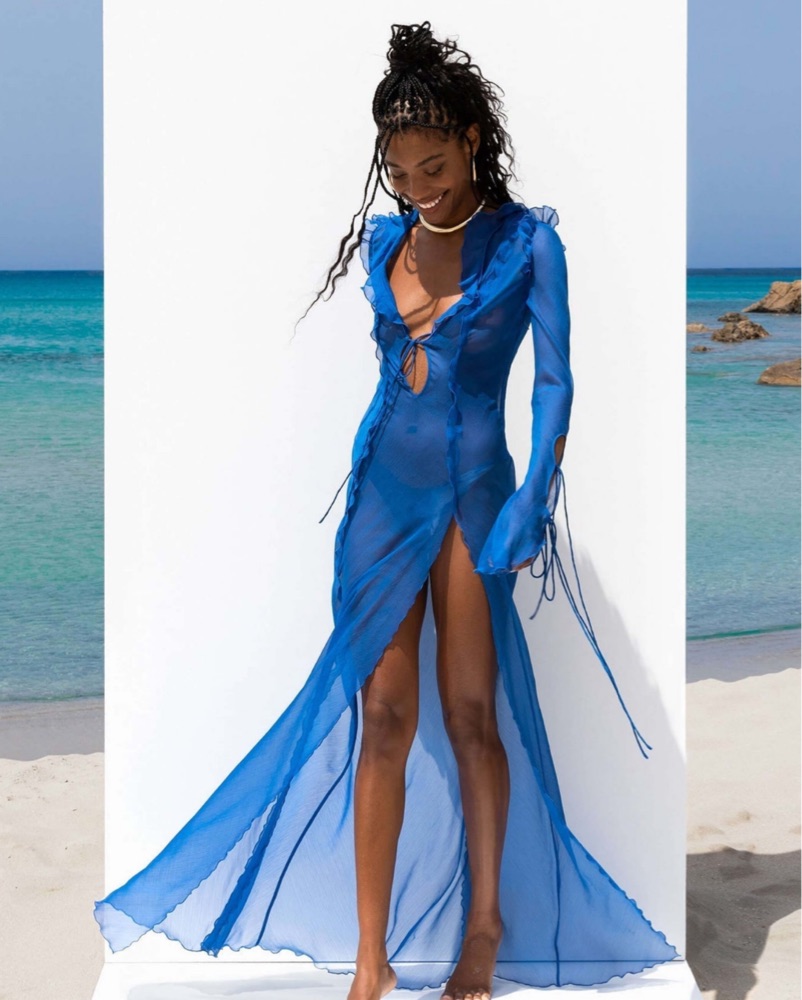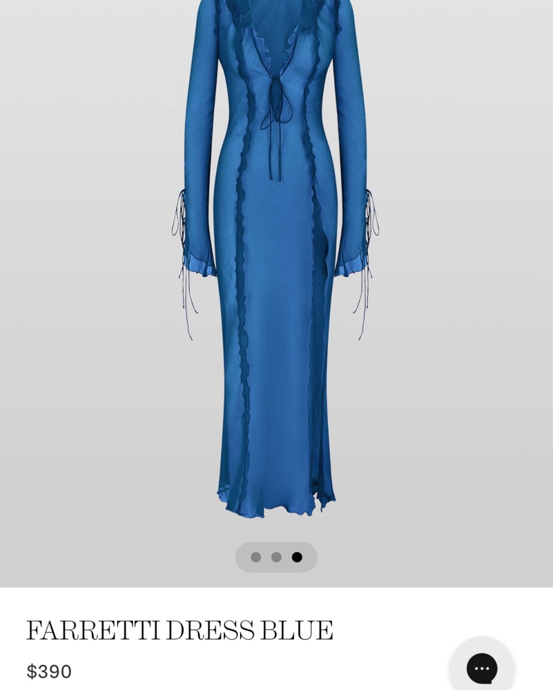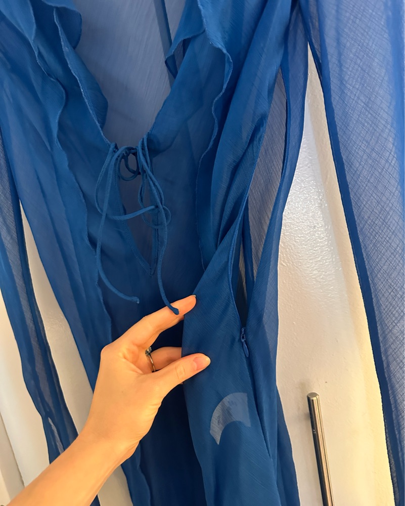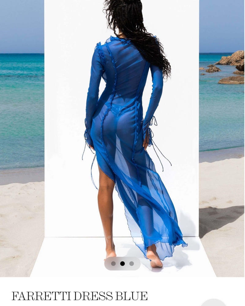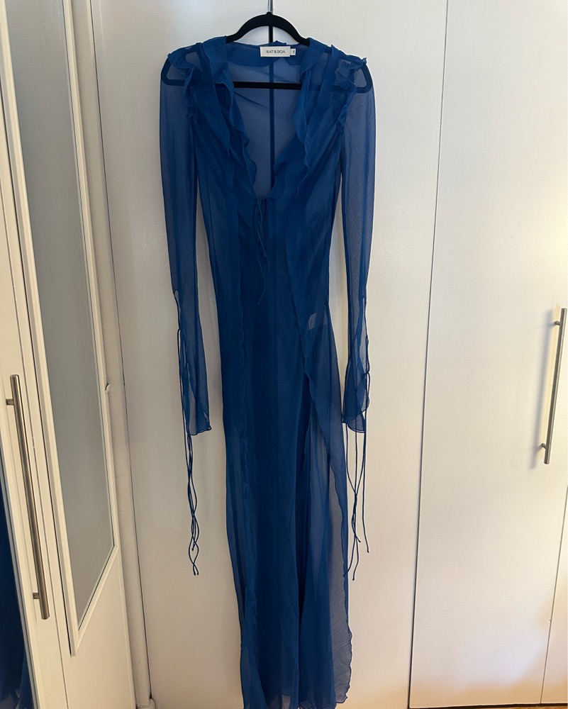 Rat & Boa Feretti maxi dress in blue size XS. This stunning blue sheer maxi dress is perfect for a special occasion or luxe beach cover up. Ties at the neckline and extra long sleeves for a witchy vibe.