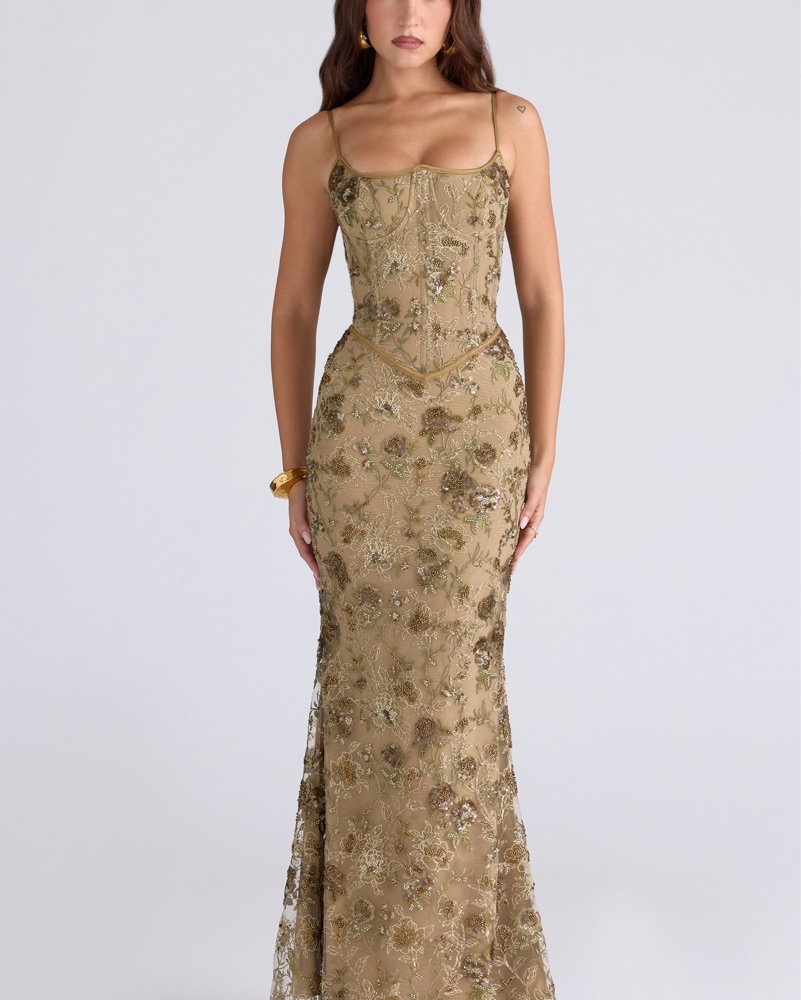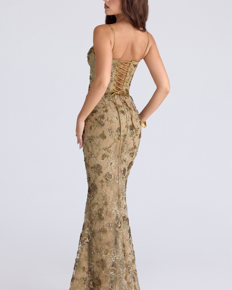 A work of art, let us introduce you to 'Naima'. This ethereal design is handcrafted with delicate hand embellished florals and sparkling beads on a sheer tulle overlay sitting against our power mesh base. The shape continues to stun and our signature corsetry comes into play to create a cinched silh