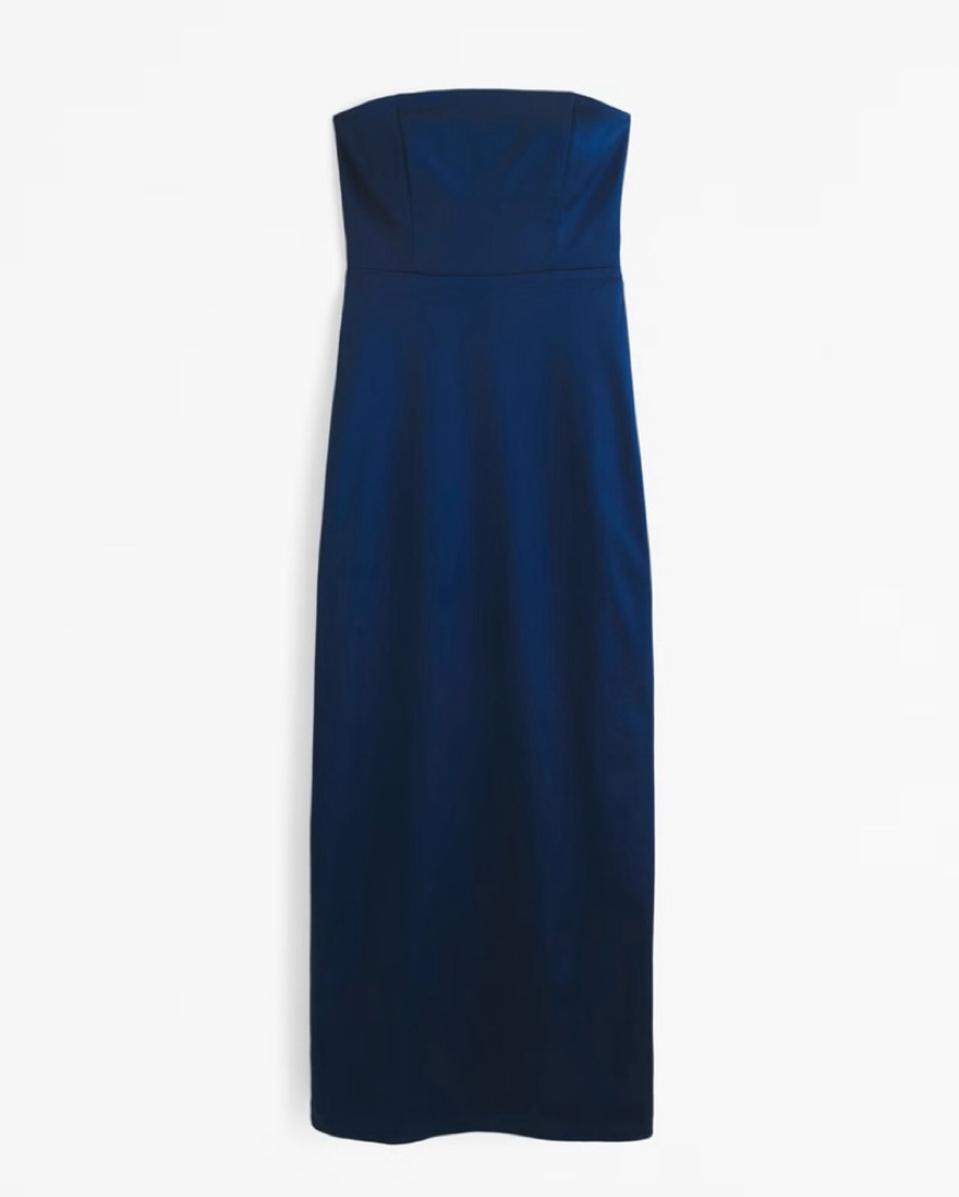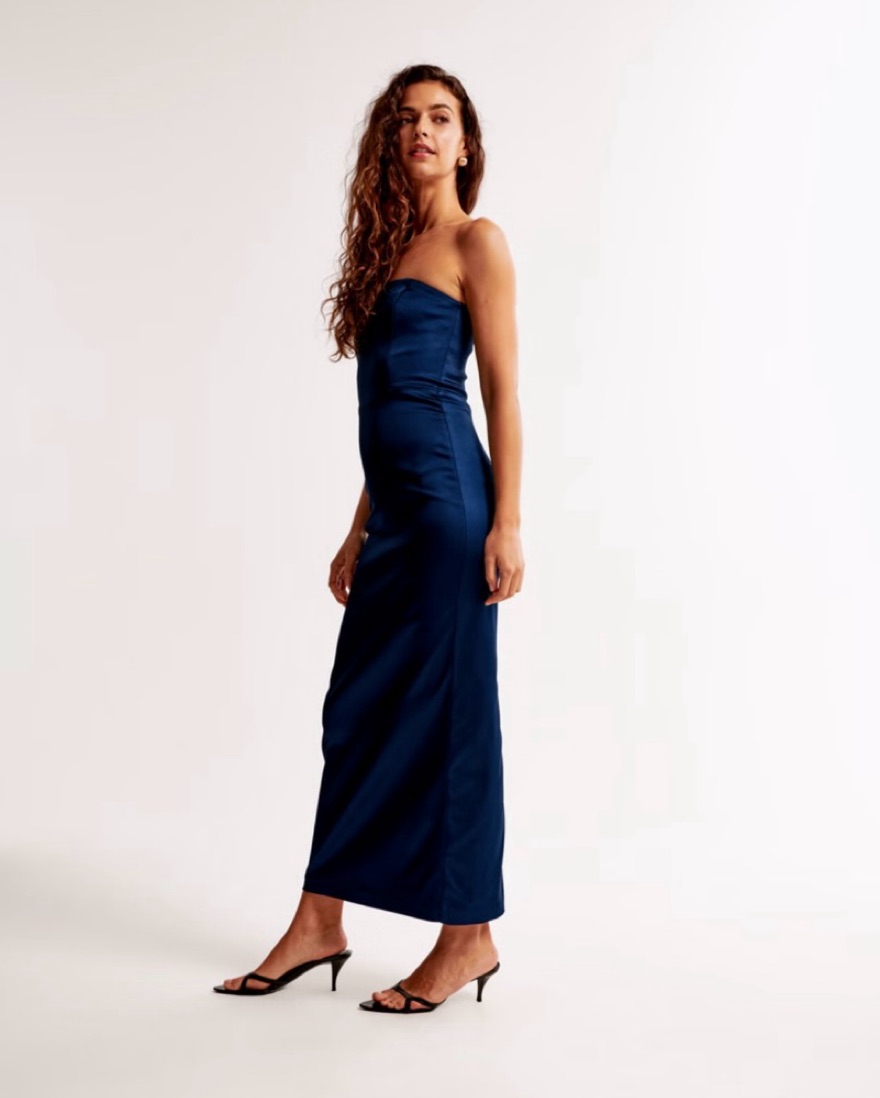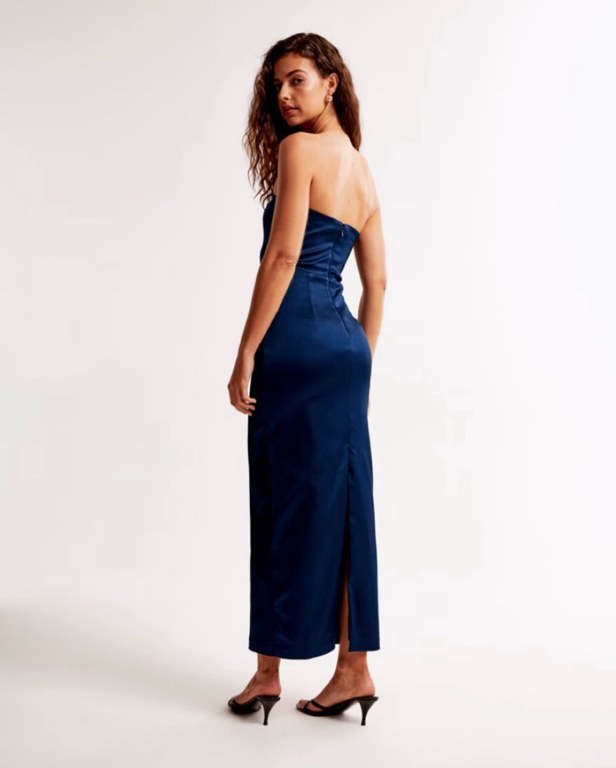 Dark Blue/Navy Abercrombie and Fitch Strapless Satin Maxi Dress. Great for semi-formal/cocktail attire events and weddings. Size is small and petite length.