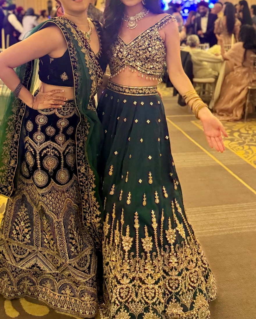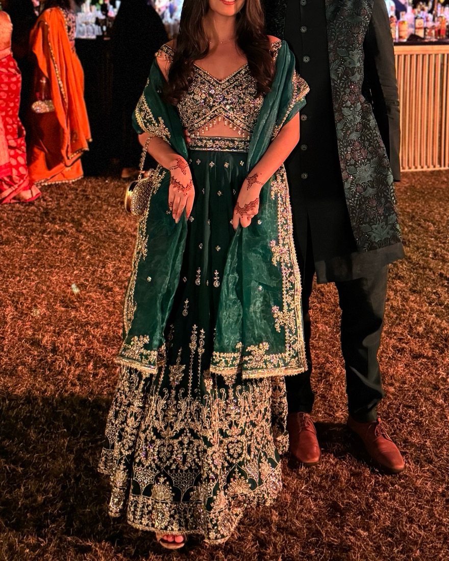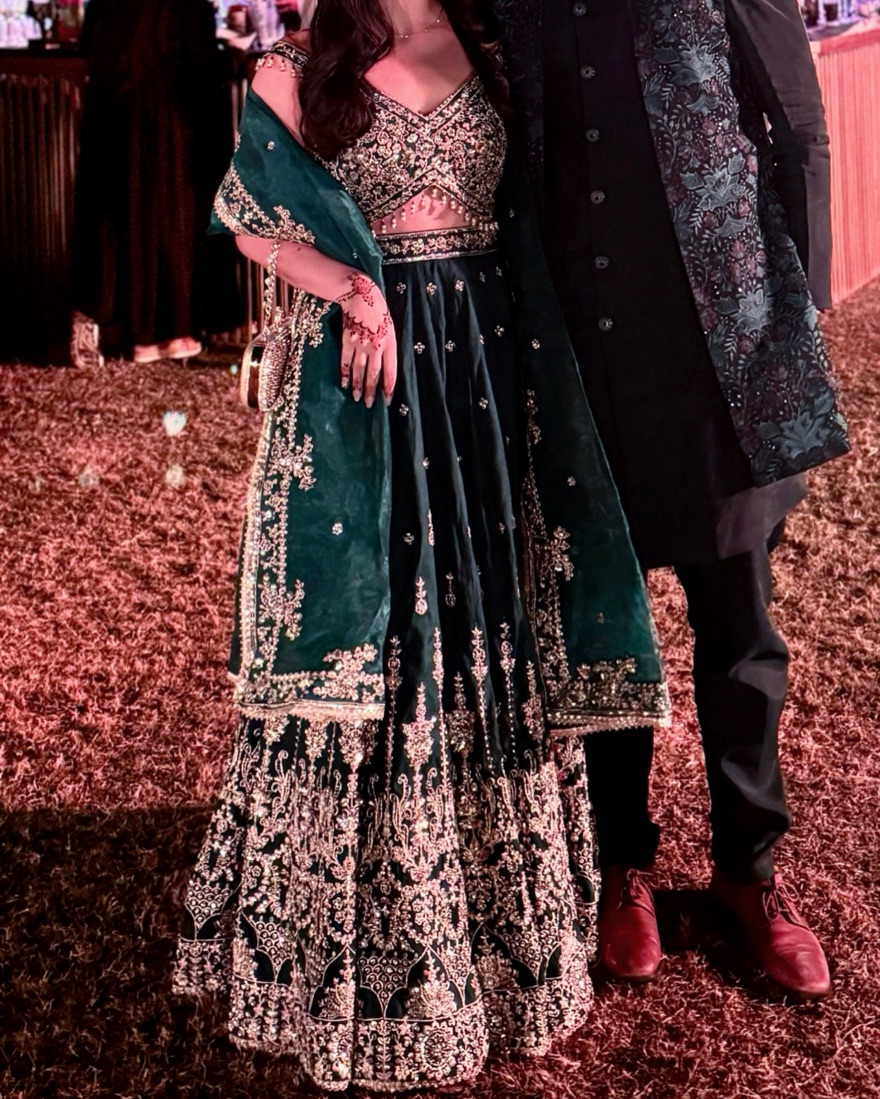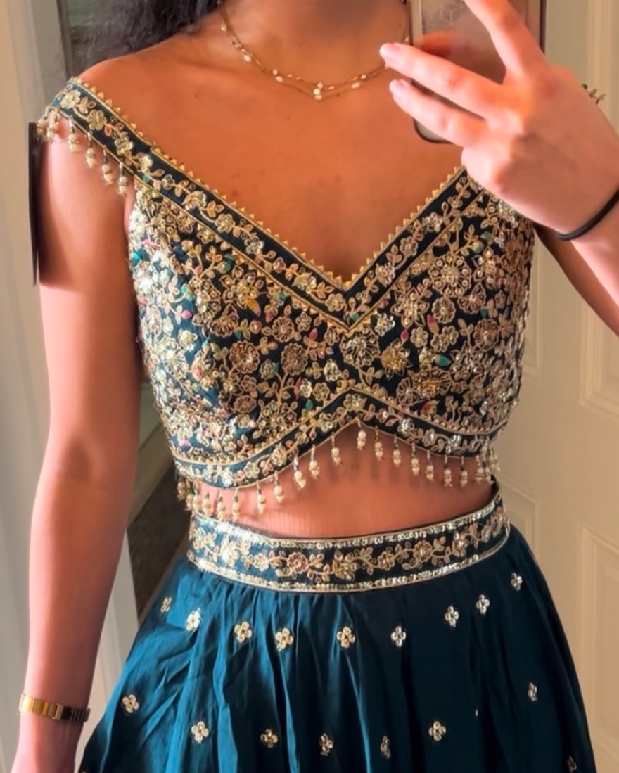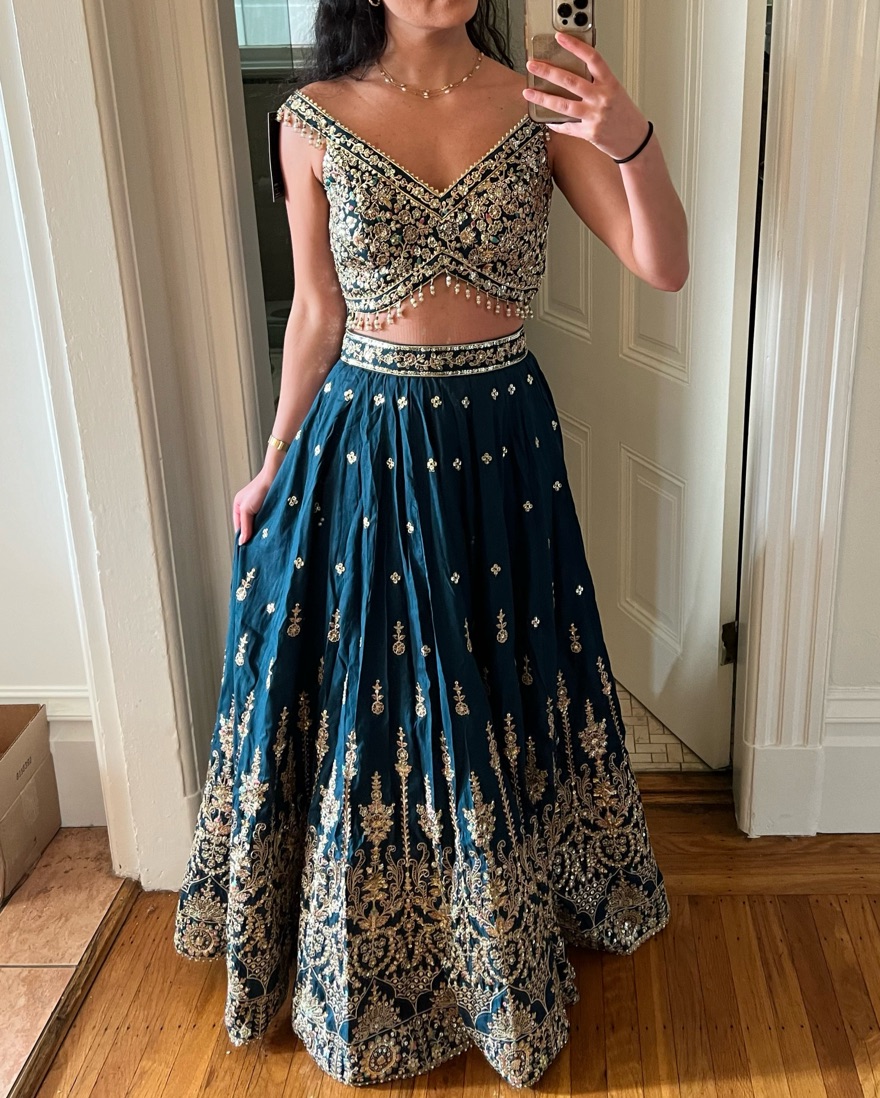 Stunning teal blue lehenga from Lashkaraa. I’m 5’4” and the length is fine with short block heels!
