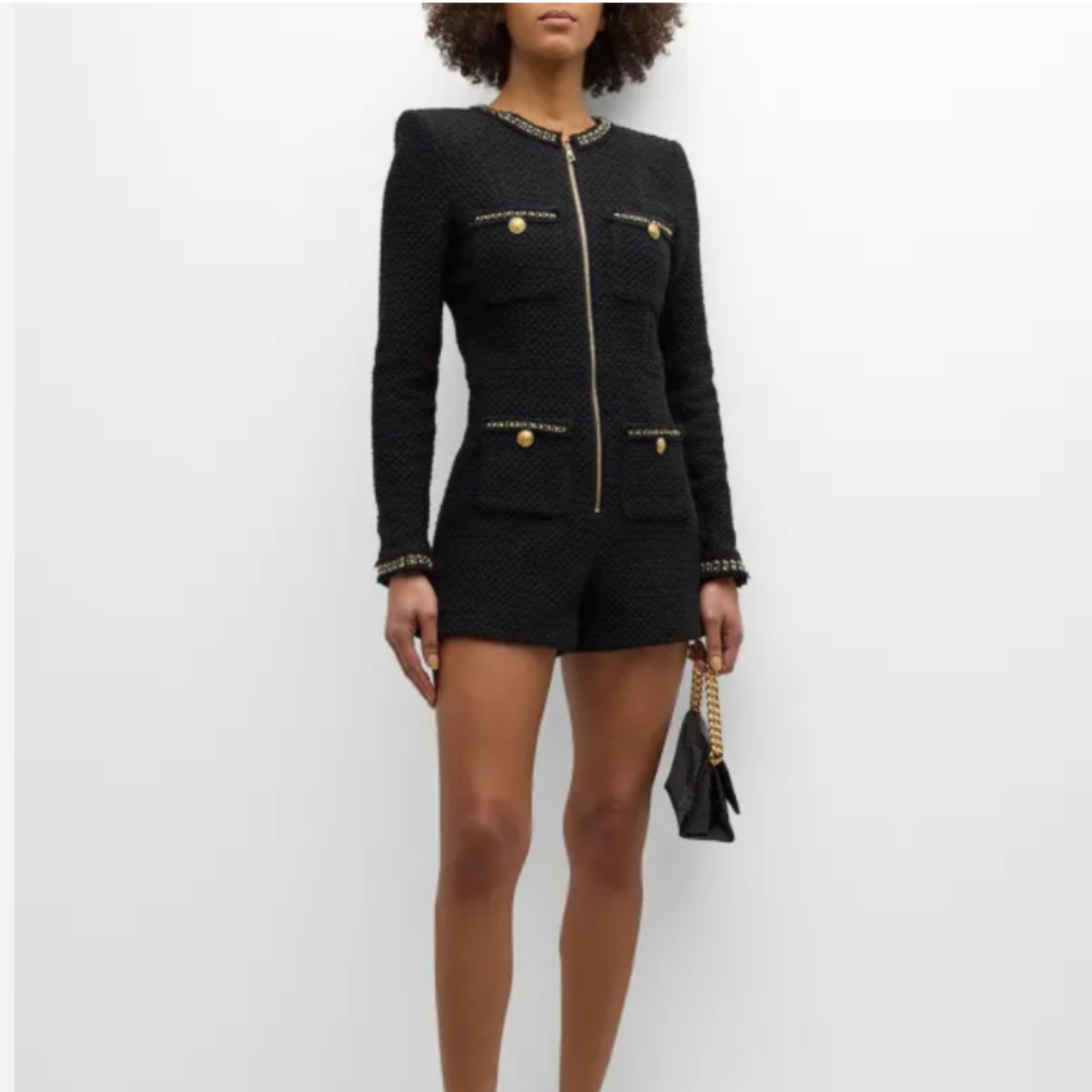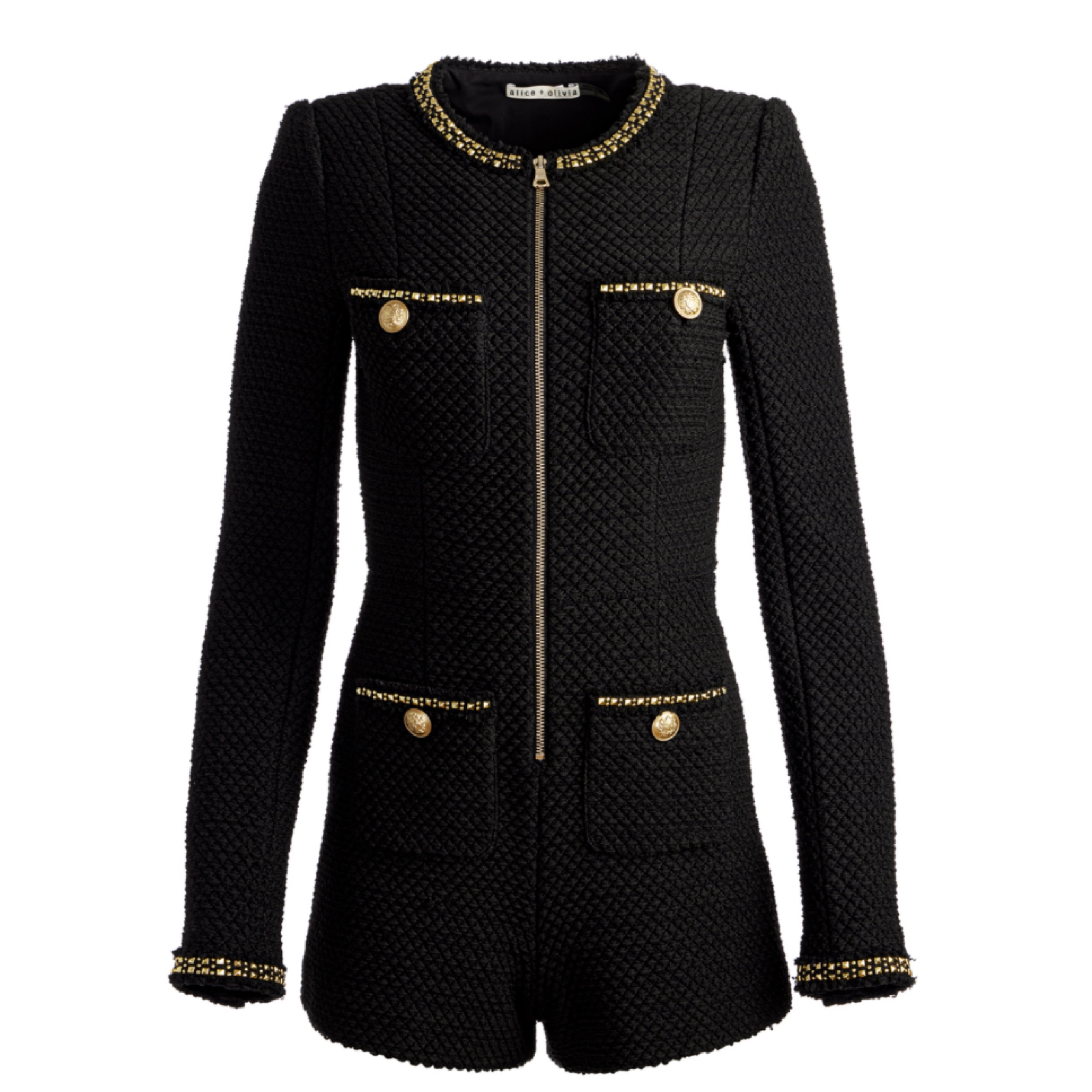 Alice + Olivia Shiloh romper in black tweed with gold zipper and button detailing. Wear to the office and then out for happy hour or dinner afterwards.