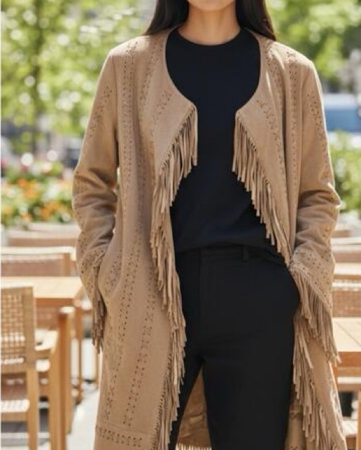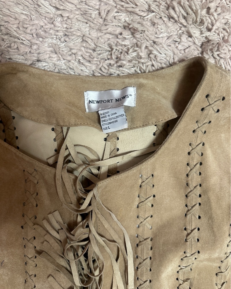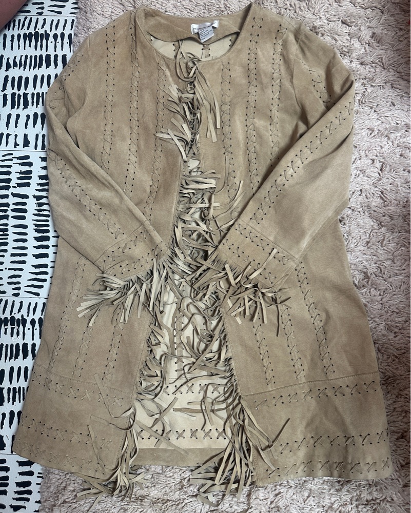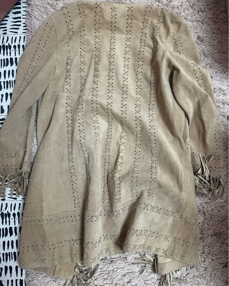 Gorgeous boho vintage genuine leather fringe jacket! The leather is so soft and comfortable, I get compliments every time I wear this. Size large, I wear it as a xs/s for an oversized look.