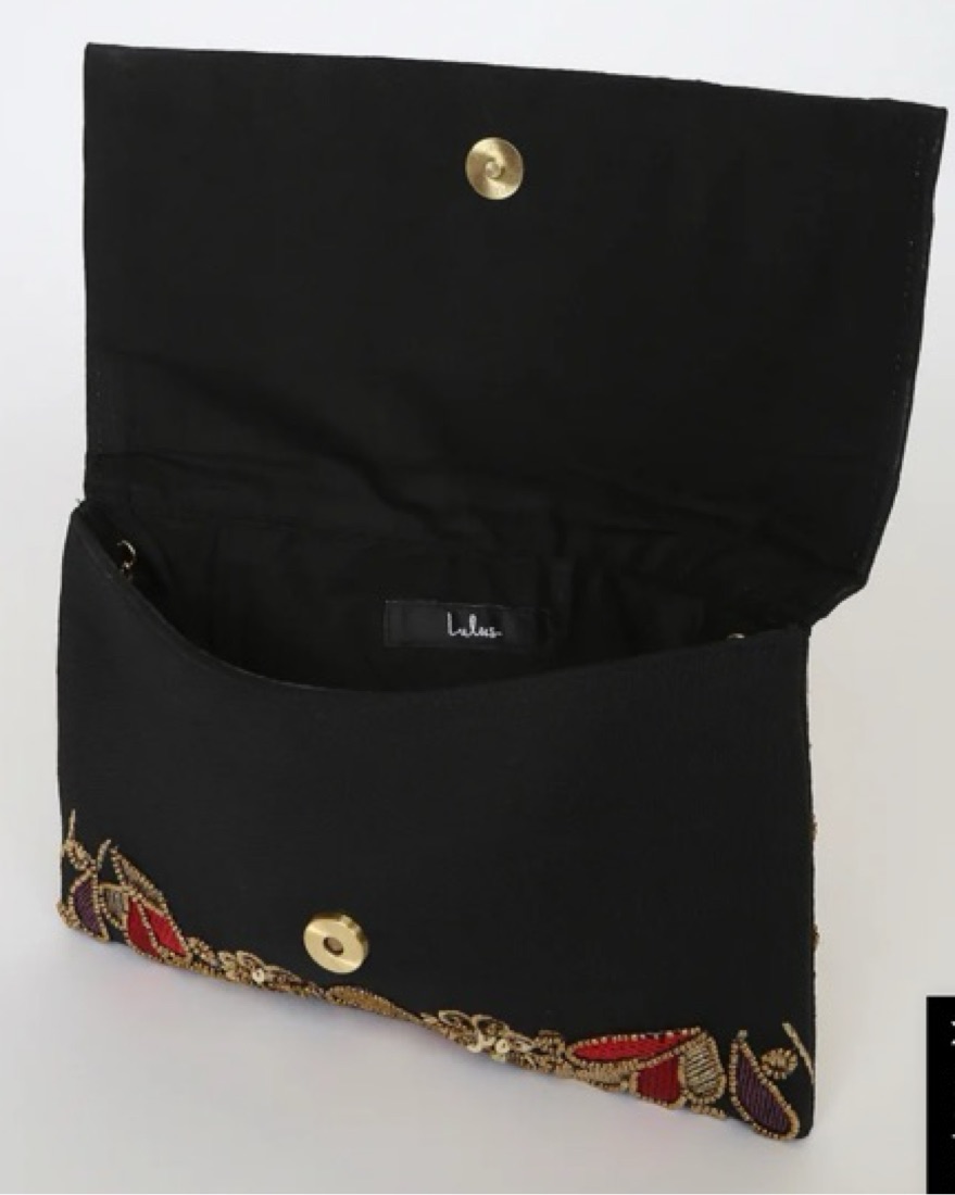 Black Multi Embroidered Clutch can liven up any look! This fold-over clutch is entirely decorated with gold, burgundy, and purple embroidery, plus shiny beads and sequins. Unfasted the hidden magnetic closure to reveal a lined interior and an attached gold chain strap.