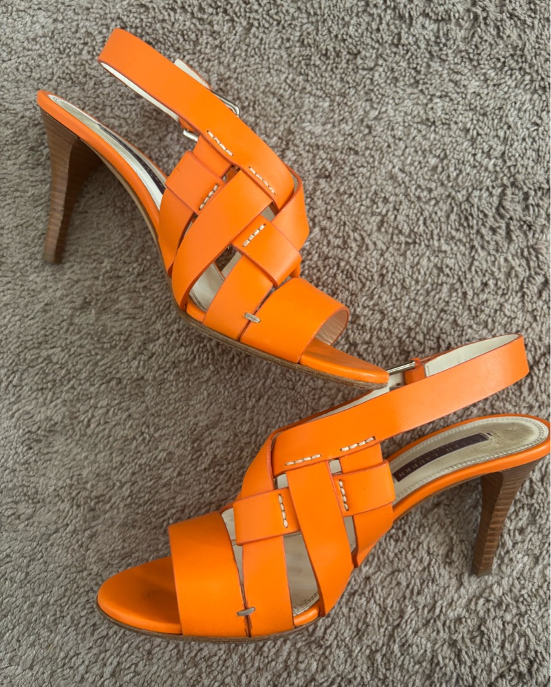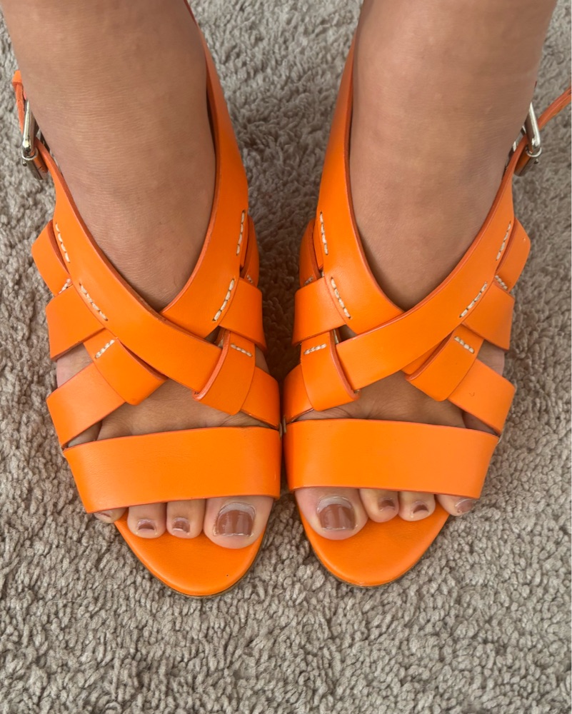 These striking orange stilettos are perfect for an evening out on the town. The bold, eye-catching color and sleek silhouette make them a statement piece that will elevate any outfit.