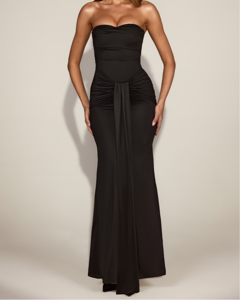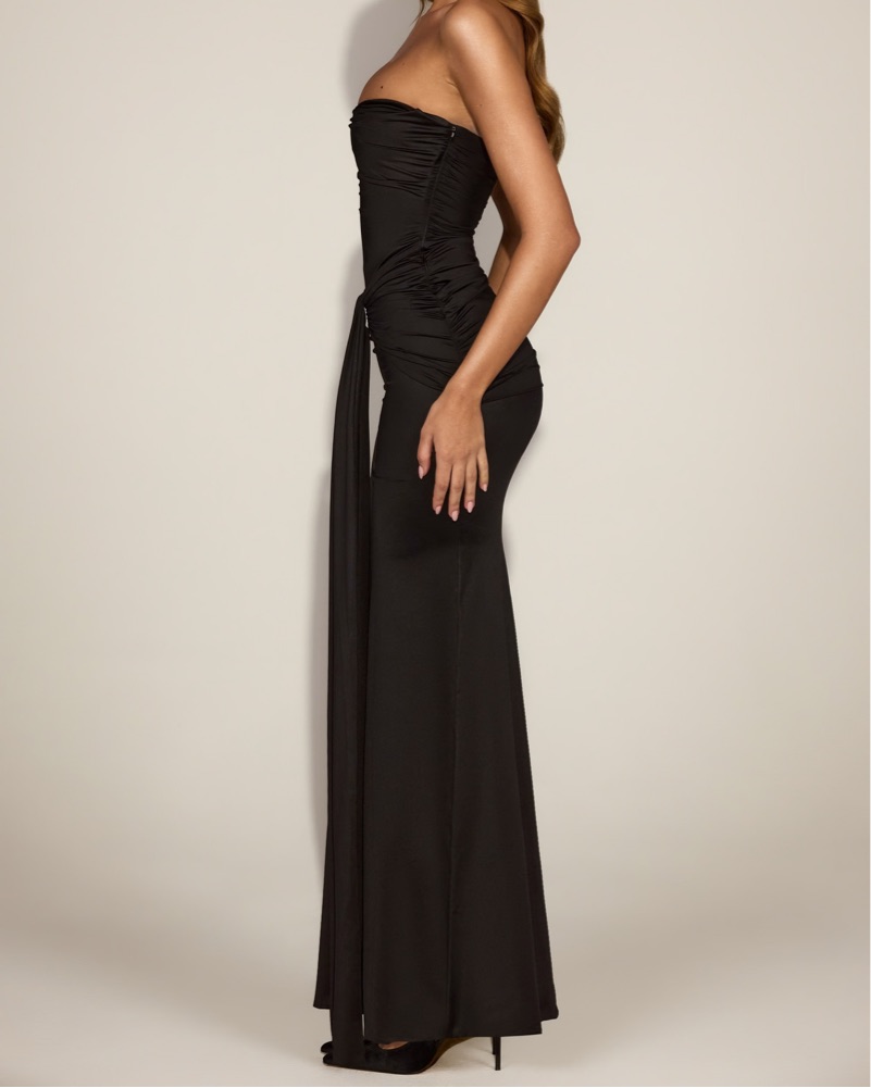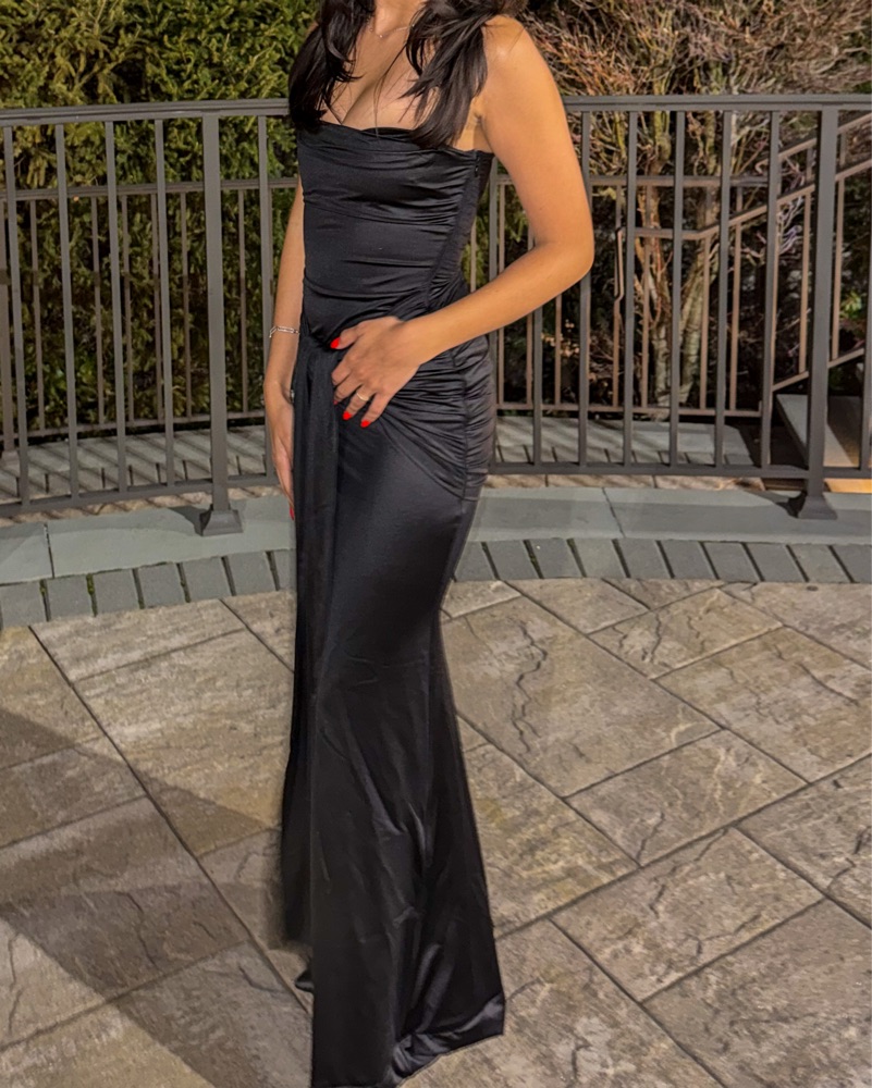 This stunning black gown is perfect for a formal event or black-tie occasion. The ruched bodice and form-fitting silhouette create a flattering and feminine look. Fit is snug. Removable hem. Worn once.