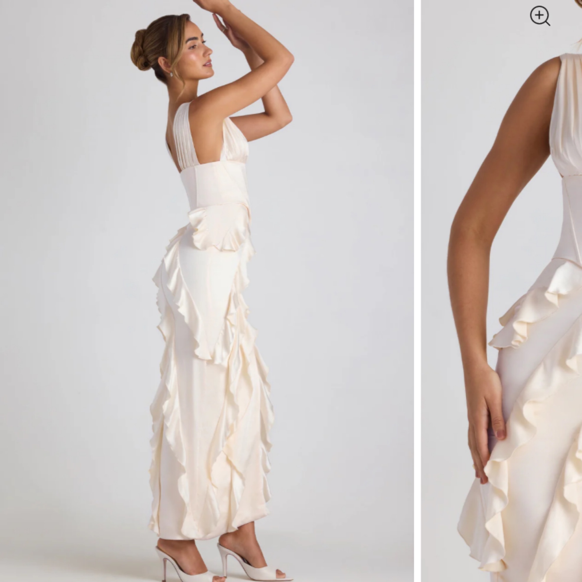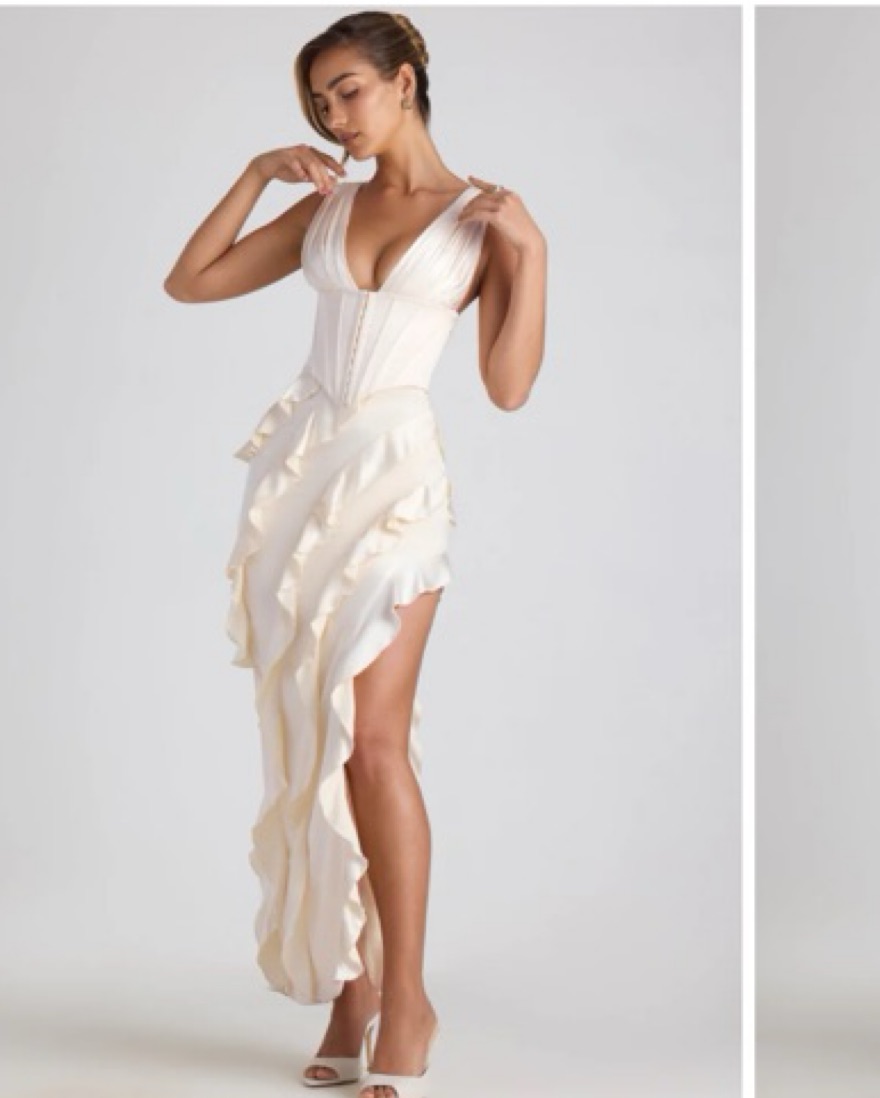 Dreamy RSVPs await. A design that's sure to turn heads, the Ambrosia dress is crafted from sumptuous matte satin with a touch of stretch and rendered in a timeless ivory hue. Cut to a maxi length with a plunging V-neckline and boned corset bodice, the fitted column silhouette is enlivened with diago
