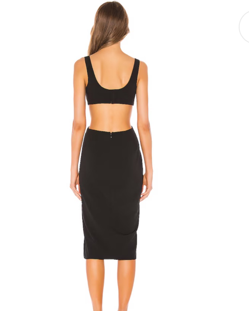 Waist cut-out and front seam slit Hidden back zipper closure