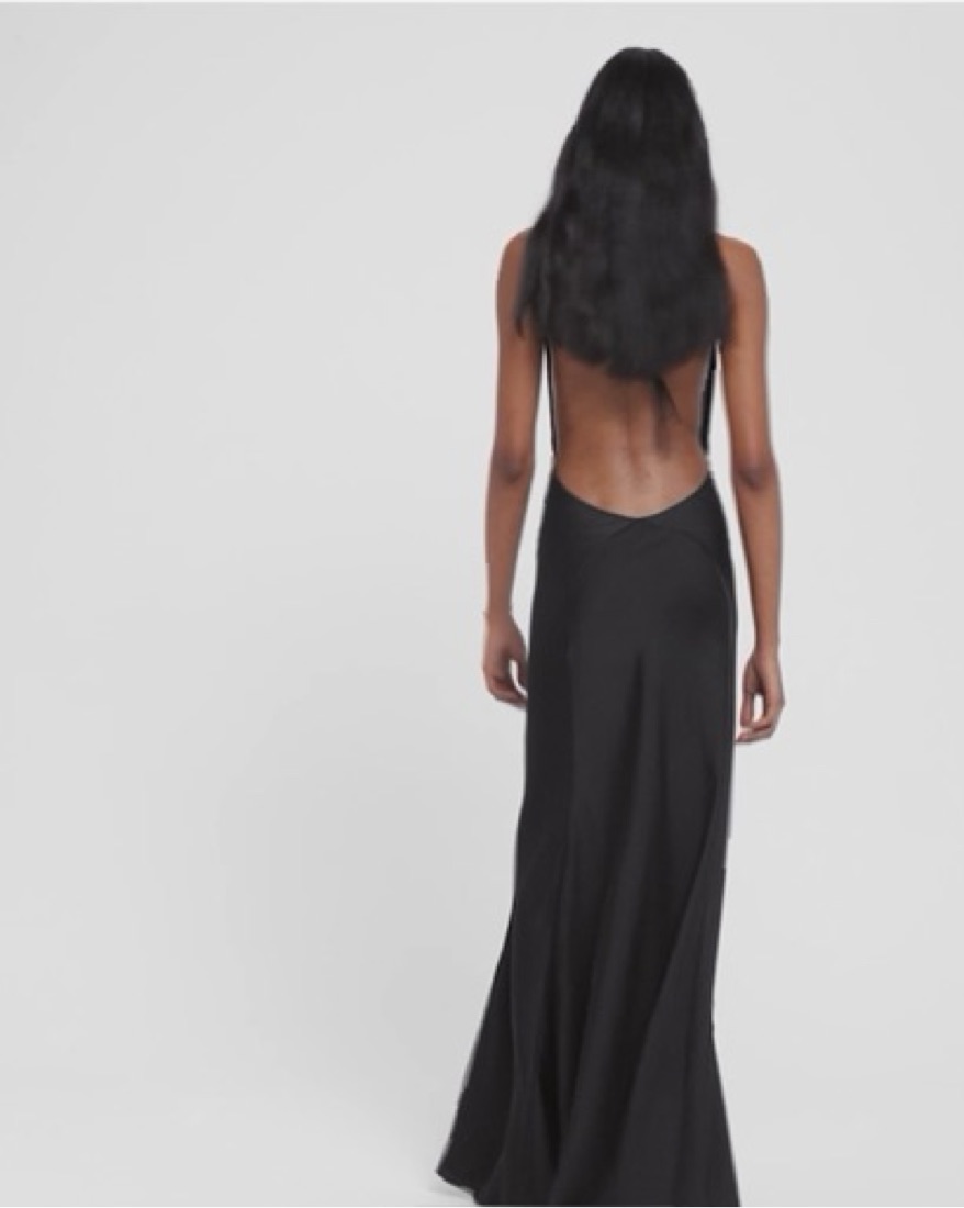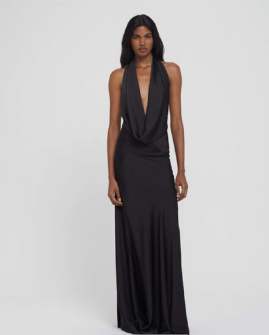 This elegant backless maxi dress is perfect for a formal event or special occasion. The black fabric drapes beautifully for a flattering, sophisticated look.