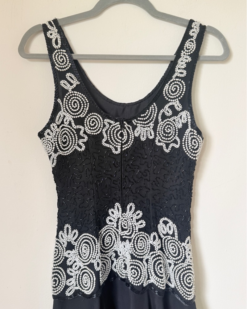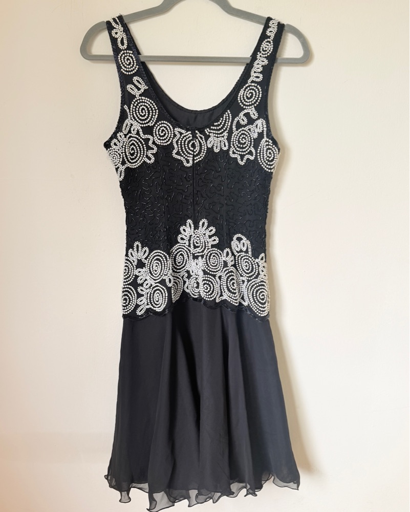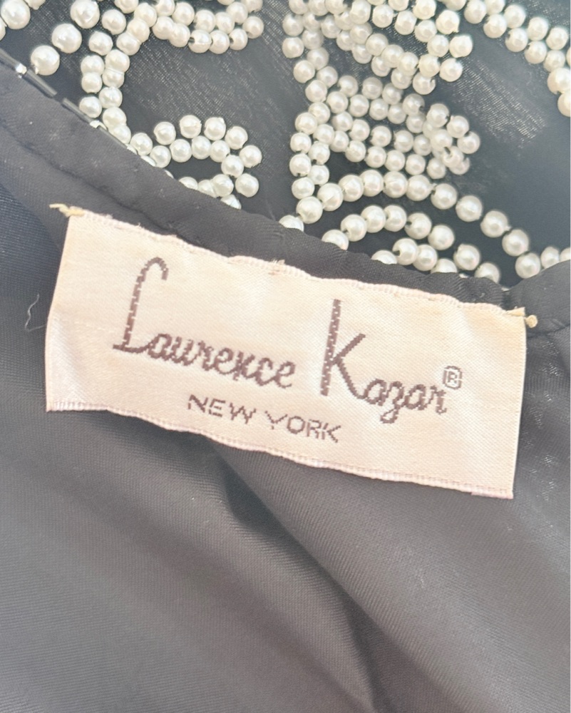 Stunning vintage Laurence Kazar New York cocktail dress featuring intricate hand-beaded pearl swirl detailing along the neckline and waist. Black silk shell with fully beaded bodice and flowing chiffon skirt. Approximate measurements: 16" bust, 12.5" waist, 15.5" hips, 38" length from top of shoulde
