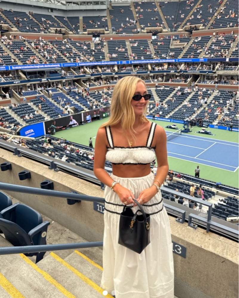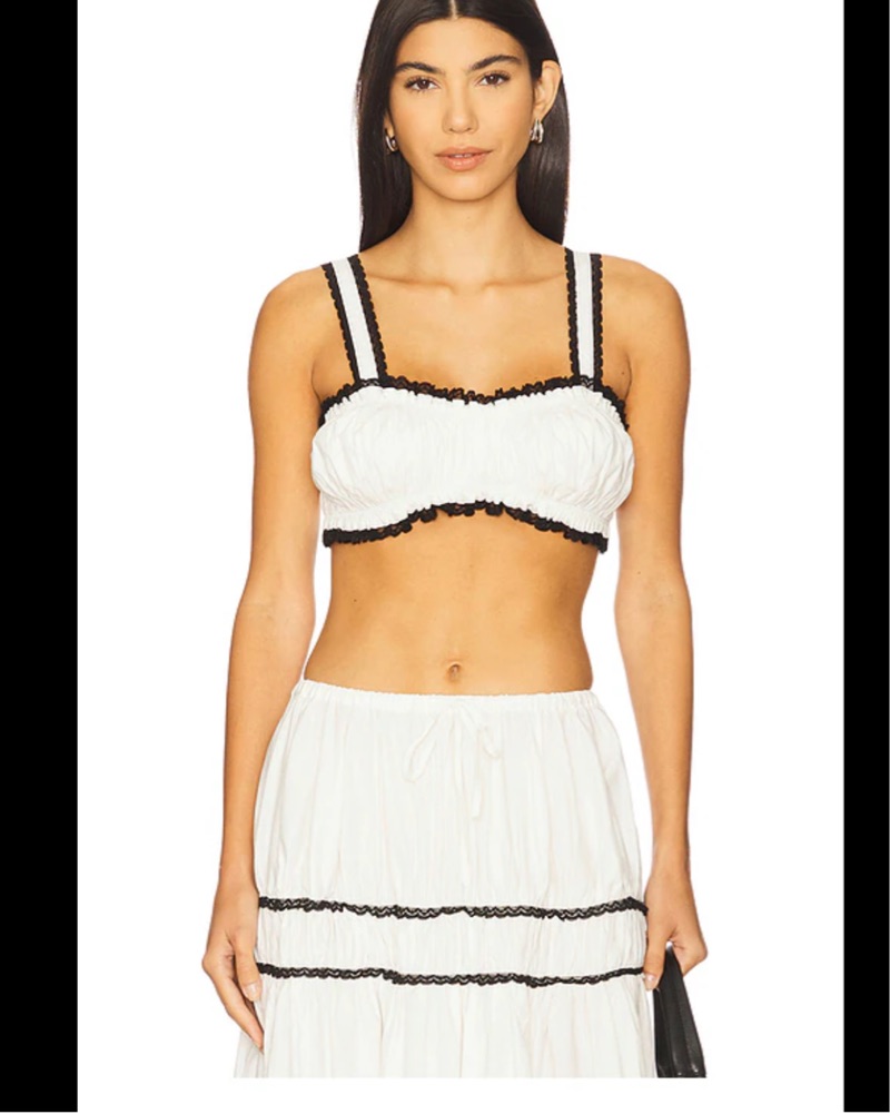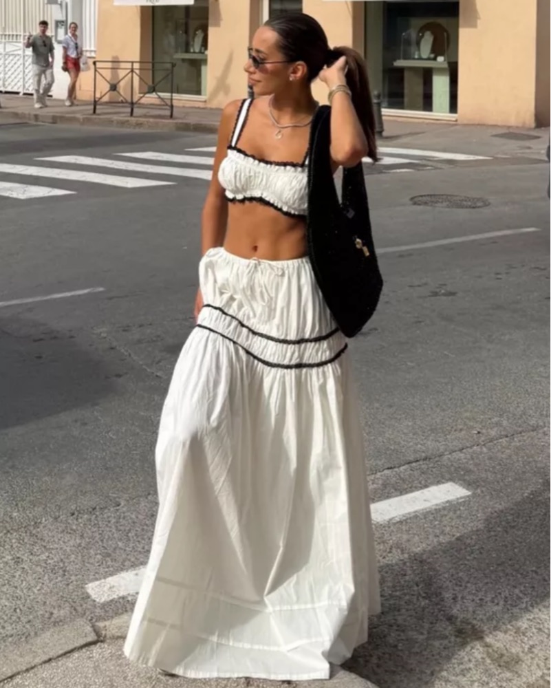 We wore what long skirt and mini crop top set black and white so chic size small both!