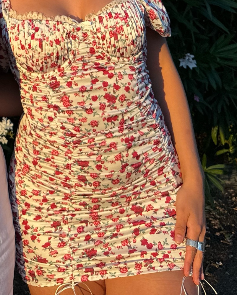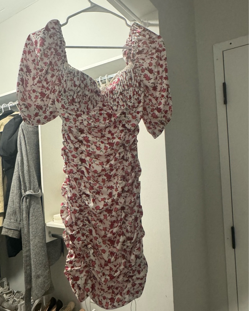 This flattering floral dress is perfect for a summer event or night out. The ruched details and puff sleeves create a flattering silhouette.