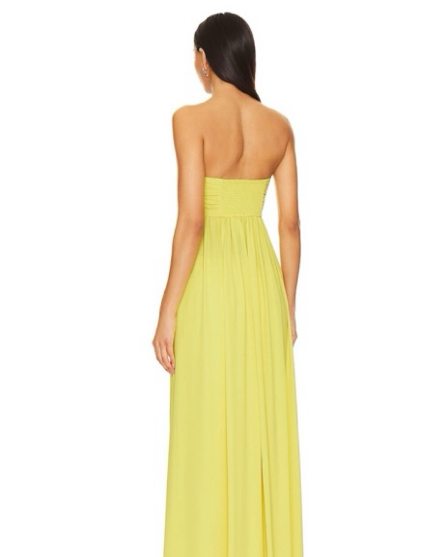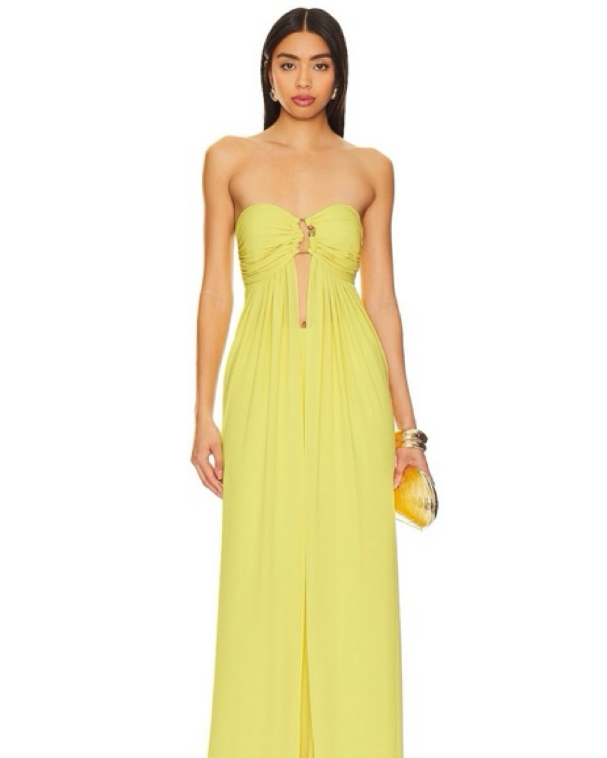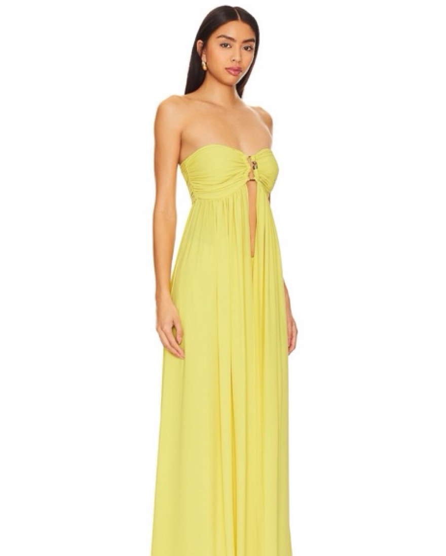 Chiffon fabric set with hidden back zipper closure on the pants. Top features draped chiffon fabric with front keyhole with gold-tone hardware and hidden zipper closure. Pants are a size L and top is a size M. Only wore once!