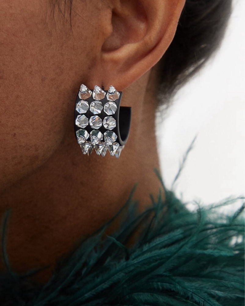 Black Karma cylindrical hoops decorated with rows of white crystal cone spikes