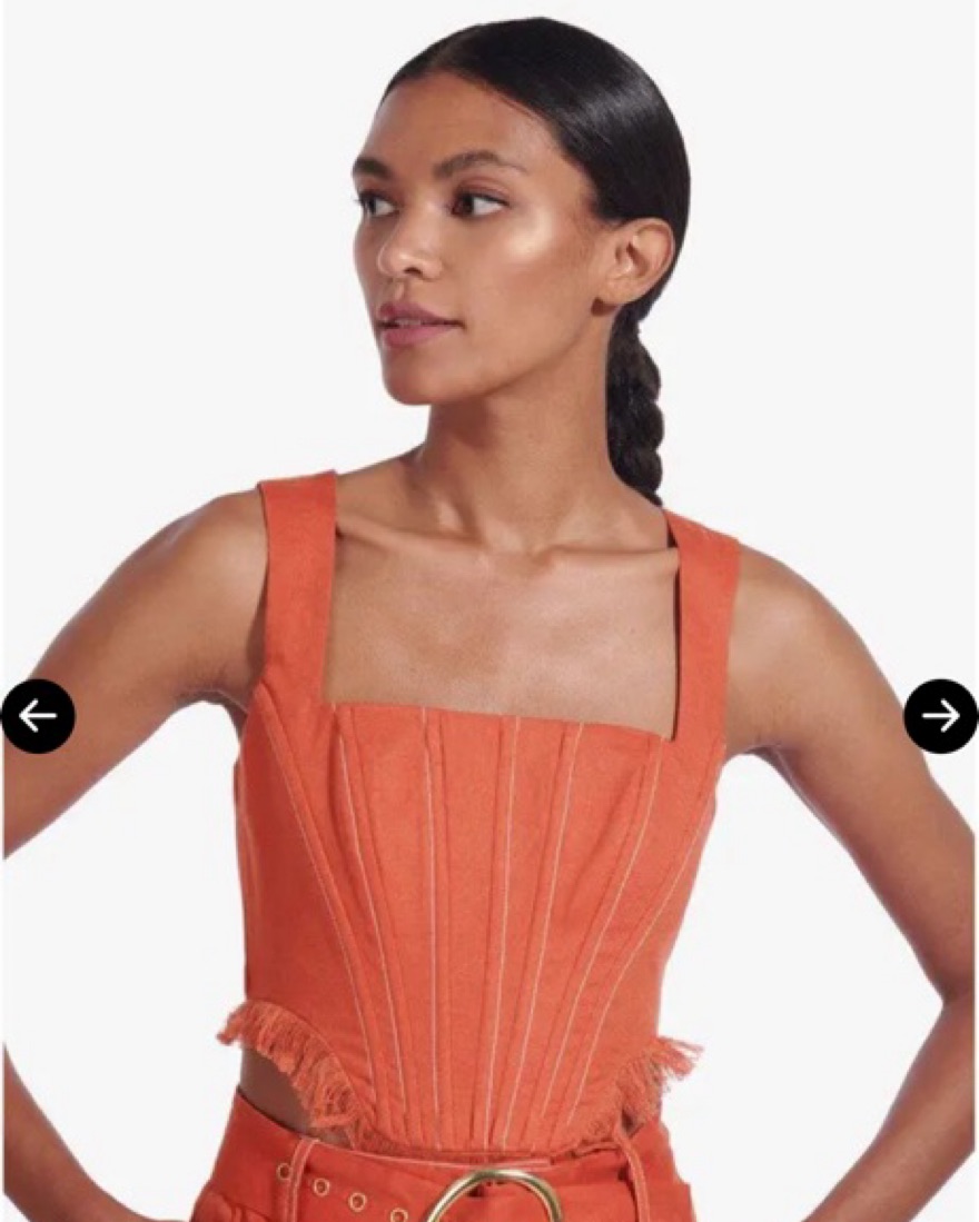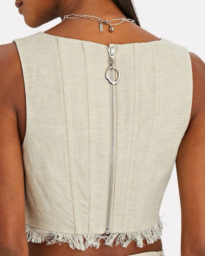 Boned bodice, frayed asymmetrical hem, square neckline, exposed zipper at back. Fabric is linen and cotton... NEW WITH TAGS. Note, it’s listed as a size 4 but runs very small and fits like a 0 or 00. There is no stretch.